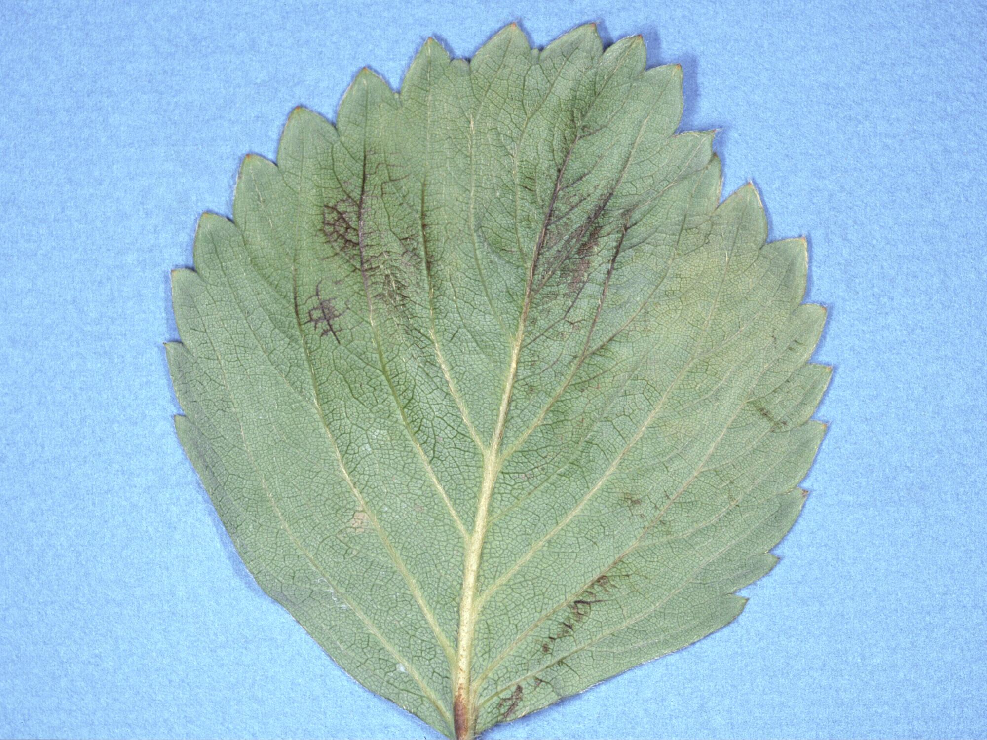 À la face inférieure d’une foliole de fraisier, présence d’un brunissement des nervures dans la partie distale de la foliole. Ce dommage prend un aspect huileux et n’évolue pas. Ce symptôme est souvent associé à des blessures de frottement qui surviennent lorsque les vents sont importants.
