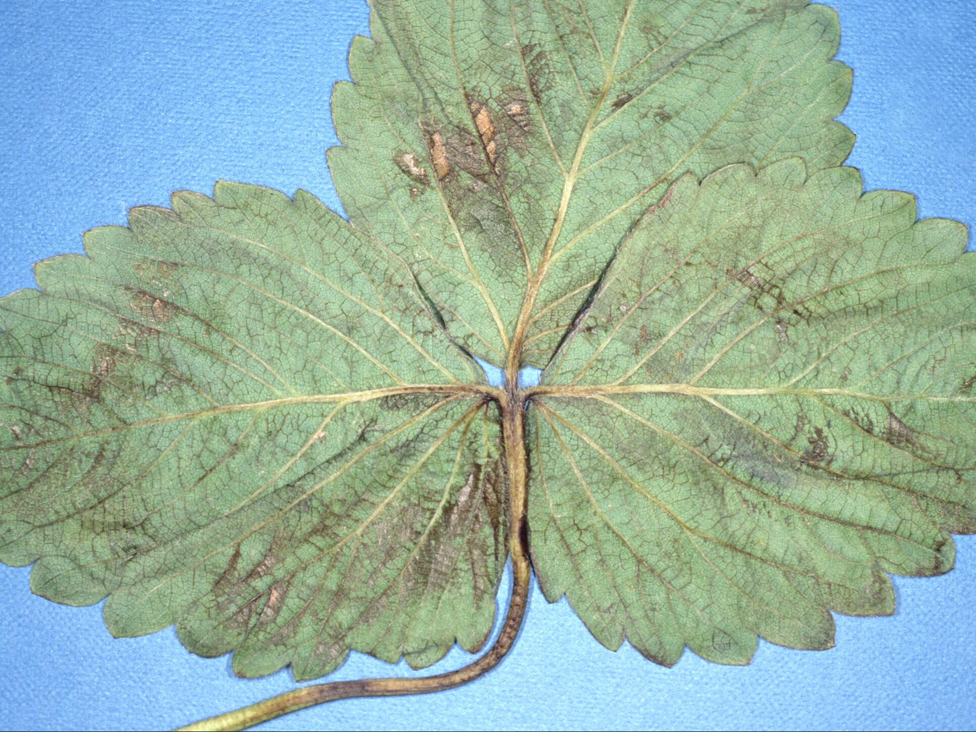 À la face inférieure d'une feuille de fraisier, présence d’un brunissement des nervures et du limbe. Ce dommage prend un aspect huileux et n’évolue pas. Ce symptôme est souvent associé à des blessures de frottement qui surviennent lorsque les vents sont importants.
