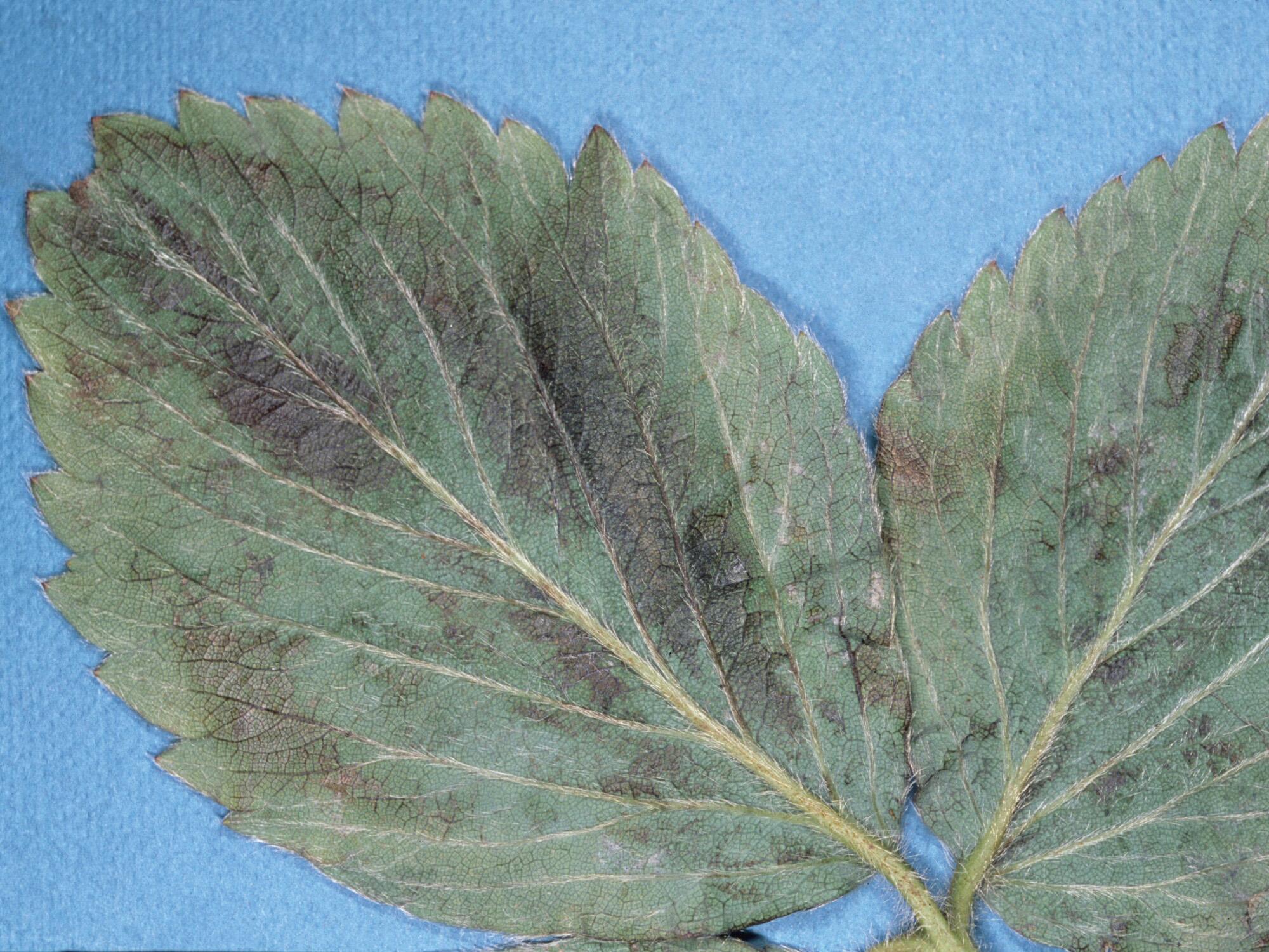 À la face inférieure des folioles de fraisier, présence d’un brunissement des nervures et du limbe. Ce dommage prend un aspect huileux et n’évolue pas. Ce symptôme est souvent associé à des blessures de frottement qui surviennent lorsque les vents sont importants.