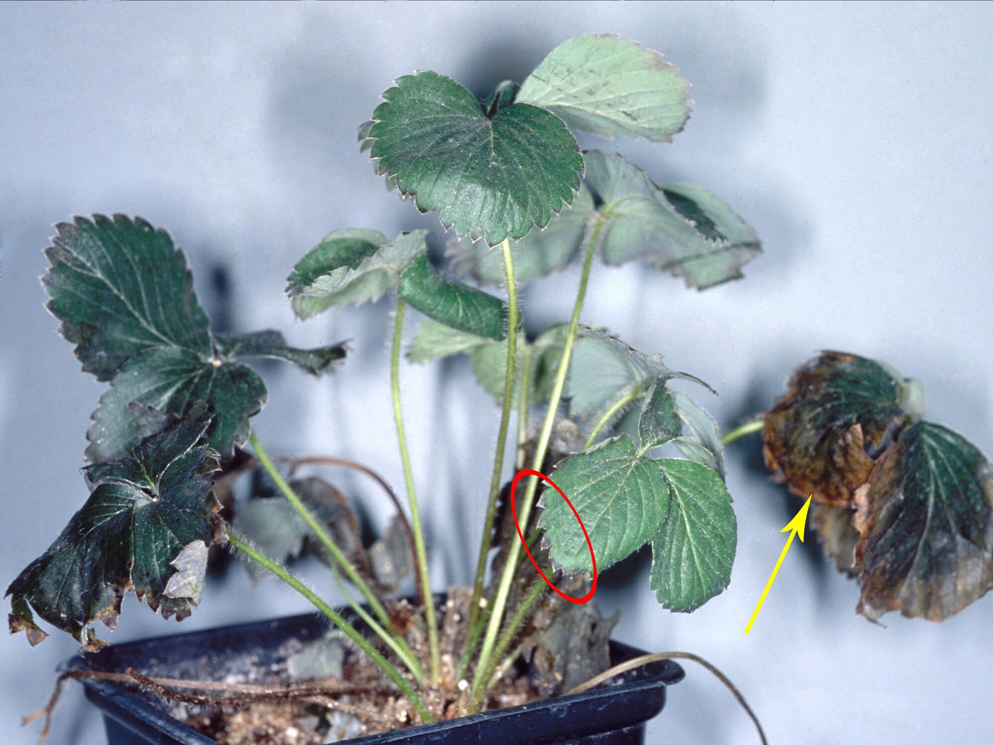 Le dépérissement des plants de fraisiers est certainement associé à la détérioration du système racinaire. Lorsque la plante perd de l'eau par transpiration foliaire, le système racinaire ne peut suppléer la perte d'eau par le feuillage étant donné qu'il est endommagé. Il s'en suit des brûlures foliaires et un dépérissement des plantes. La détérioration des racines peut être la conséquence d'une salinité élevée ou d'un excès d'eau dans le substrat.