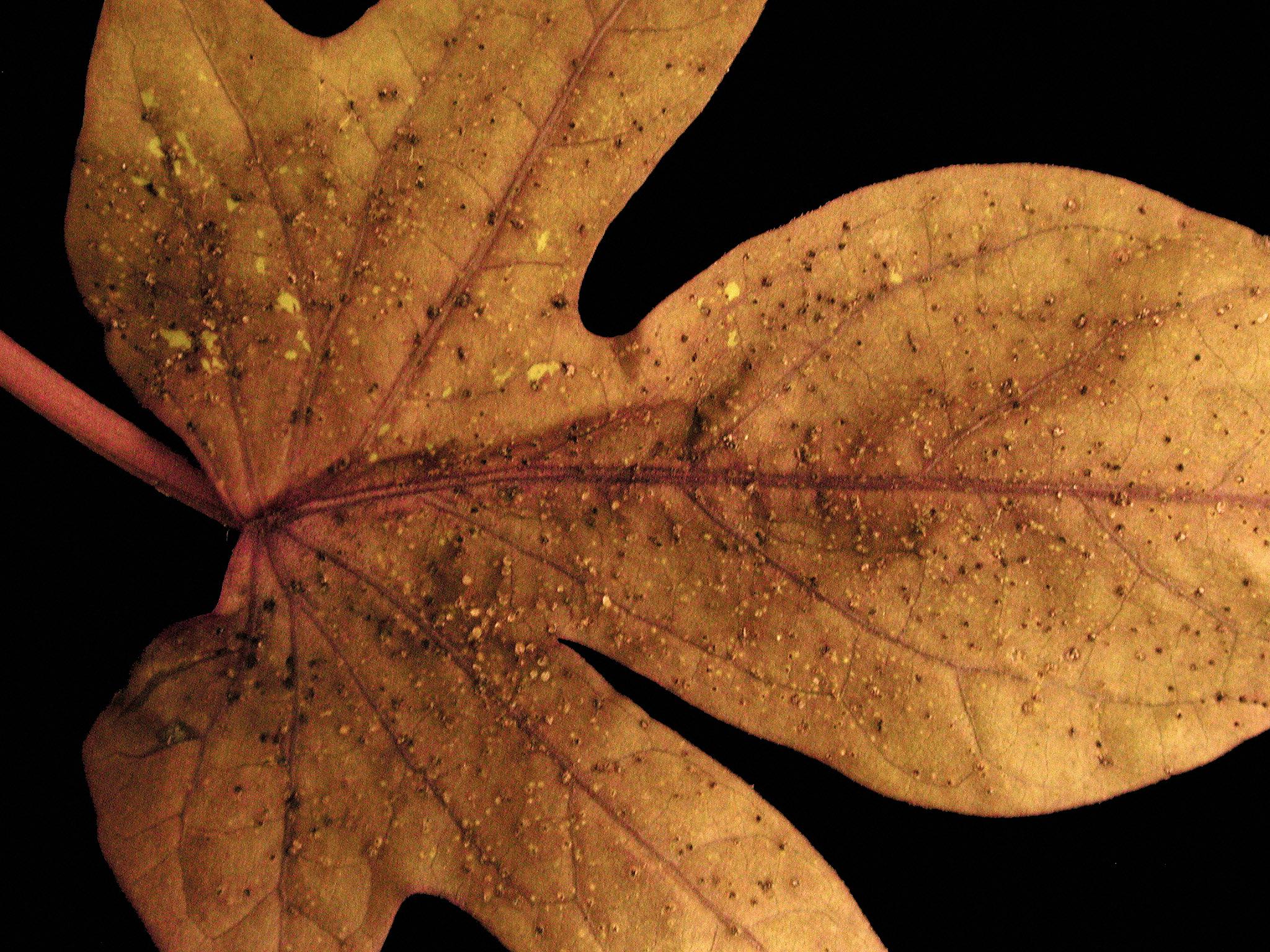 Protubérances blanchâtres et noires sur une feuille d'ipomée