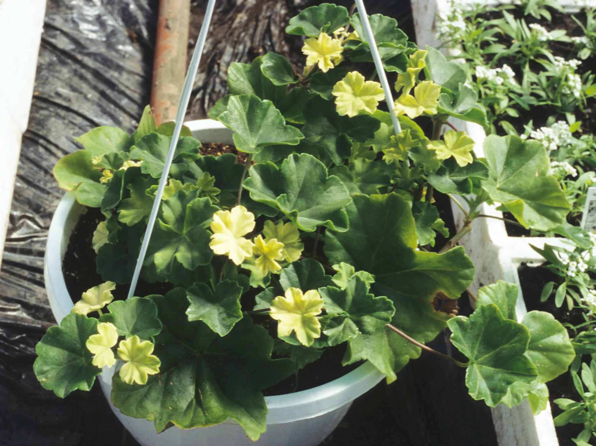 Un géranium lierre montre un jaunissement des jeunes feuilles. Ce plant était placé vis-à-vis la sortie d'air chaud d'une fournaise à air chaud. Seuls les plants situés à proximité de la fournaise présentaient le symptôme (ilot de plants). Le jaunissement des feuilles est une conséquence de la destruction de la chlorophylle due à une température de l’air trop élevée causée par de l’air trop chaud émis par la fournaise. Ce stress de chaleur est différent de celui causé par la température élevée de l’air ambiant de la serre qui cause la mortalité des tissus atteints et vise l’ensemble des plants de la serre.