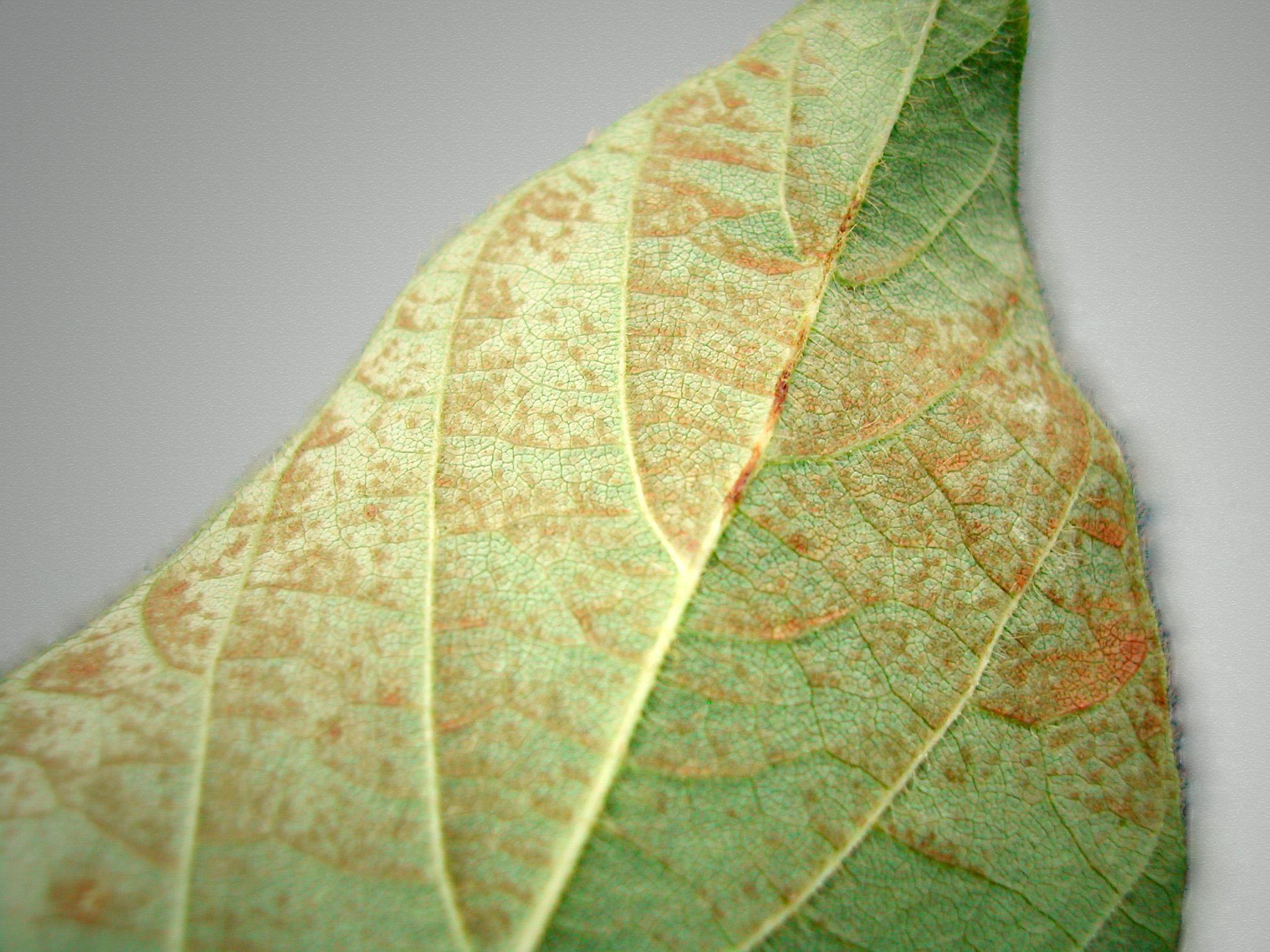 Une vue rapprochée de la face inférieure d’une foliole de soya montre une brûlure rouille à brune près de l’apex. La délimitation entre les tissus affectés et les tissus sains est nette. Ce symptôme est caractéristique d’une insolation survenue lors de journées venteuses et très ensoleillées avec une température élevée.