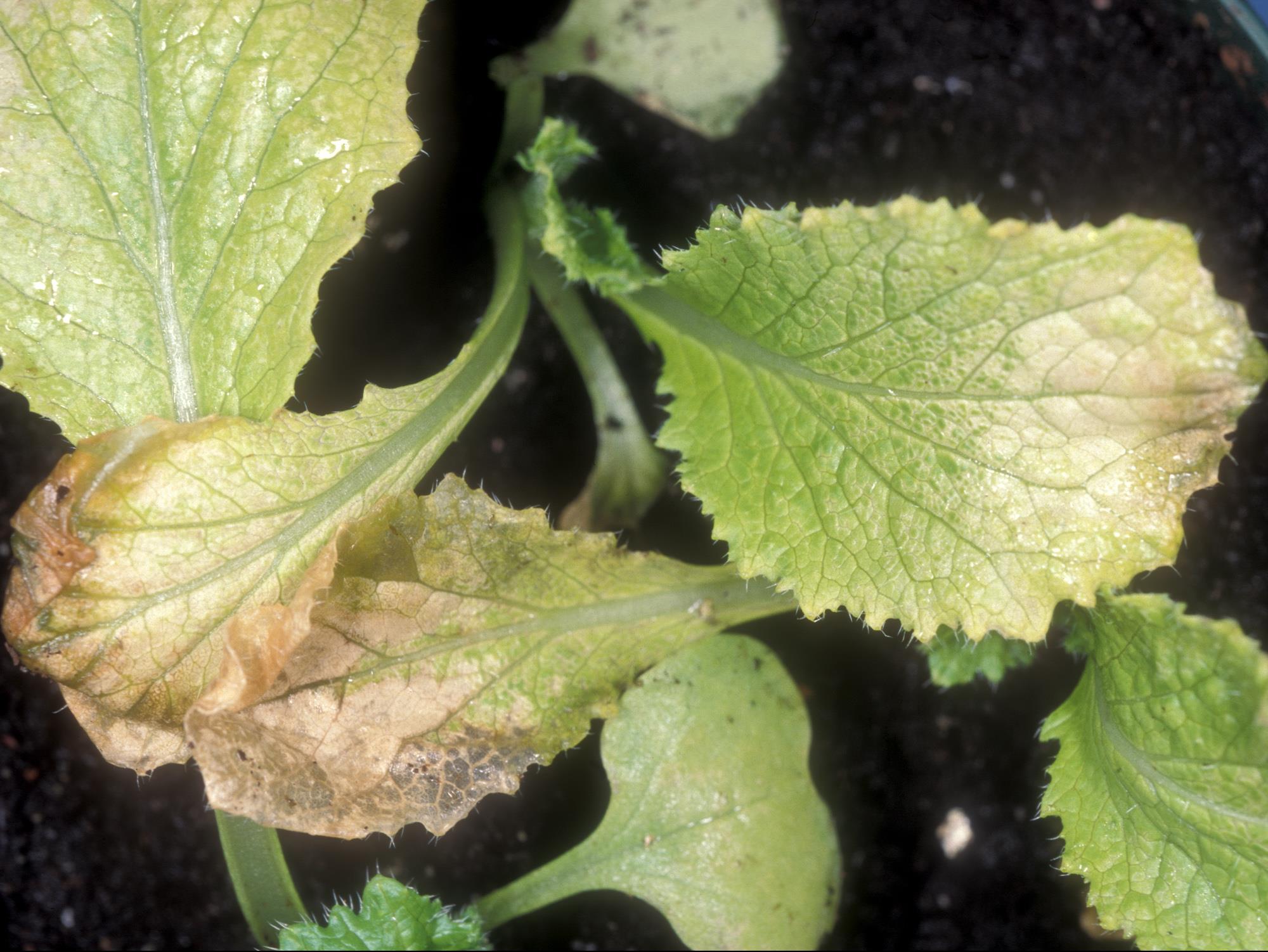 Sur des plantules de choux chinois provenant d’une serre, les feuilles basales présentent un blanchiment partiel ou total du limbe. Certaines feuilles ont une brûlure marginale. Les nouvelles feuilles sont vertes et les racines sont sans symptôme. Les tests de laboratoire se sont avérés négatifs pour la détection de champignons et le pH et la salinité sont adéquats.