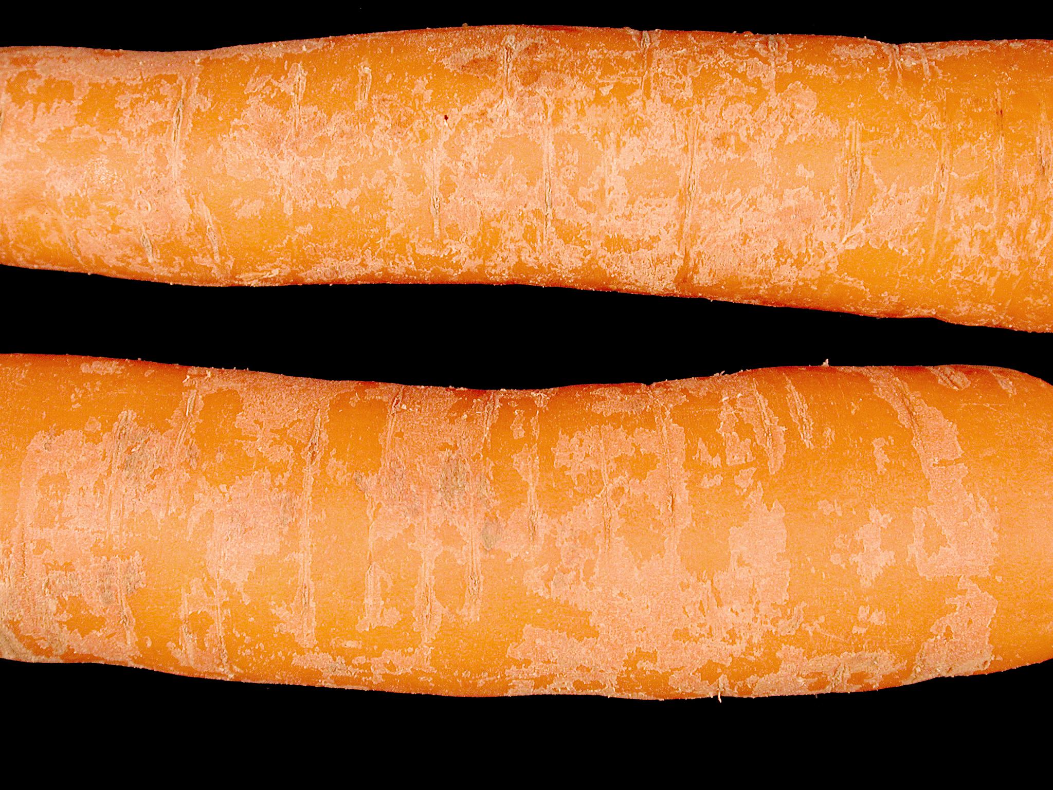 Sur des carottes (cv 'HM 02') provenant d’un entrepôt, décollement d’une fine pellicule blanchâtre à grisâtre de l’épiderme des racines. Ces dommages sont causés par une humidité relative trop basse lors d’un entreposage prolongé. Ce phénomène est connu comme la desquamation chez la carotte.