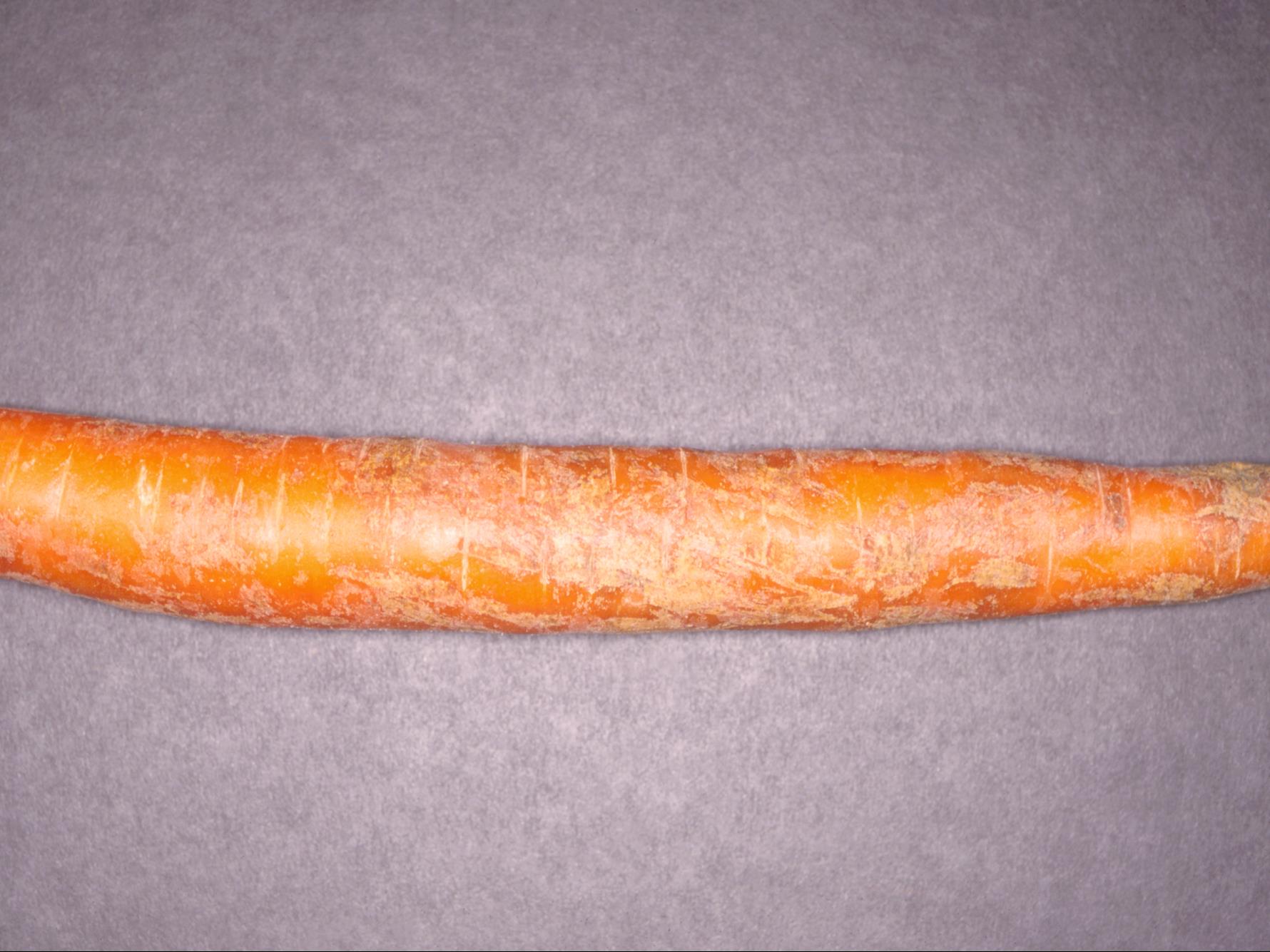 Après le lavage de carottes entreposées, des taches brunes, sèches, superficielles et souvent striées se manifestent au hasard sur l’épiderme, mais pas aux lenticelles. La chair sous ces taches est intacte (non visible ici). Il pourrait s’agir de meurtrissures (blessures mécaniques) qui apparaissent parfois après le lavage.