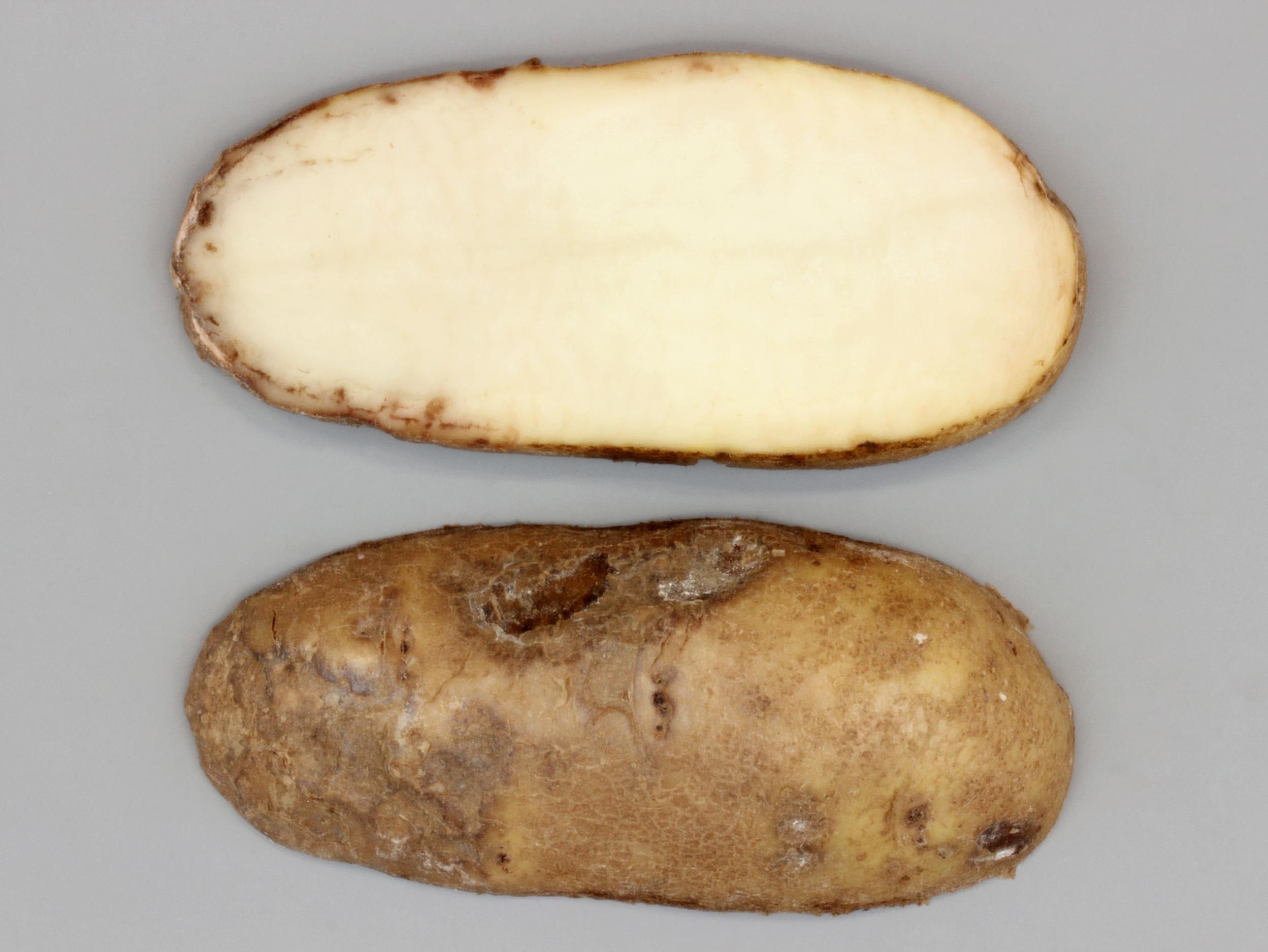 Le périderme d’un tubercule de pomme de terre (cv 'Goldrush') provenant d’un entrepôt montre une large zone foncée et déprimée, d’une forme irrégulière, dans la région du talon. L’autre moitié du tubercule montre une chair brunie sur quelques millimètres de profondeur et un anneau vasculaire brun dans la zone affectée. Aucun agent pathogène n’a été détecté des tubercules. Les symptômes sont causés par du gel en entrepôt (température basse de l’air).