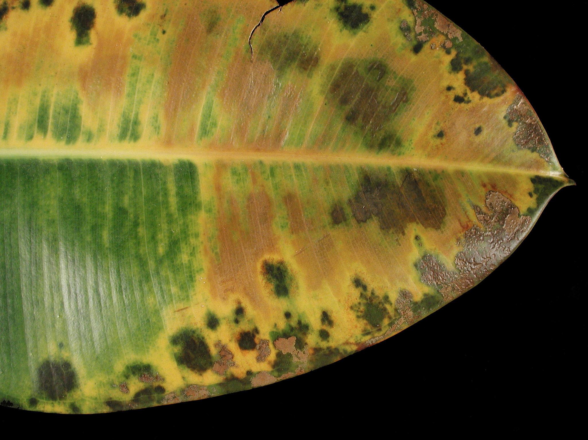 Taches brunes et jaunissement sur feuille de caoutchouc des jardins