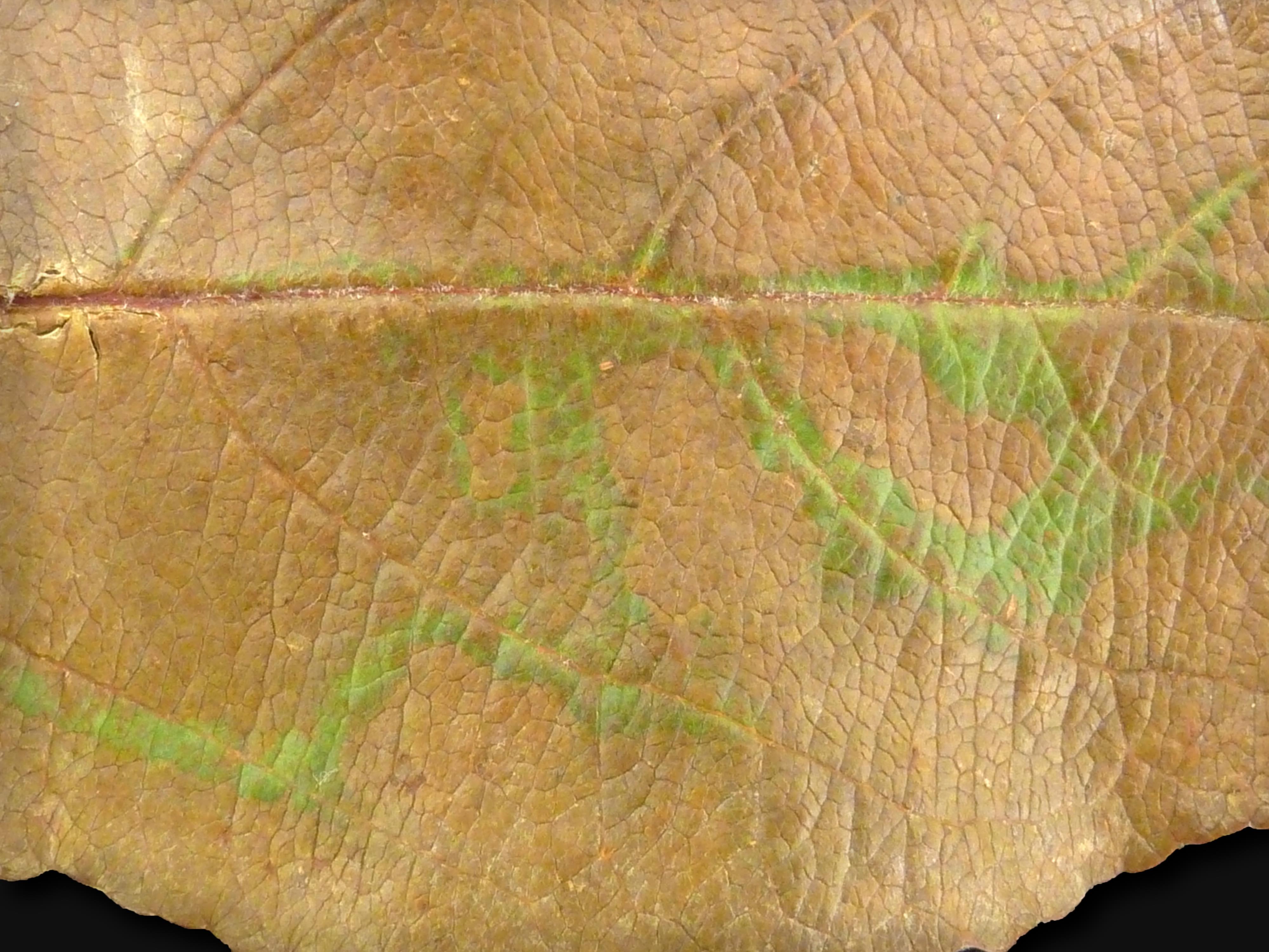 Une vue rapprochée d’une feuille de pommier montre un brunissement sur presque tout le limbe. Seules quelques nervures sont vertes. L’analyse de la teneur en éléments minéraux des feuilles a révélé une teneur en magnésium (Mg) de 0,0951 % (951 mg/kg ou ppm). Les résultats d’analyse foliaire révèlent une carence en magnésium. La concentration adéquate de cet élément est de 0,25 à 0,40 %.