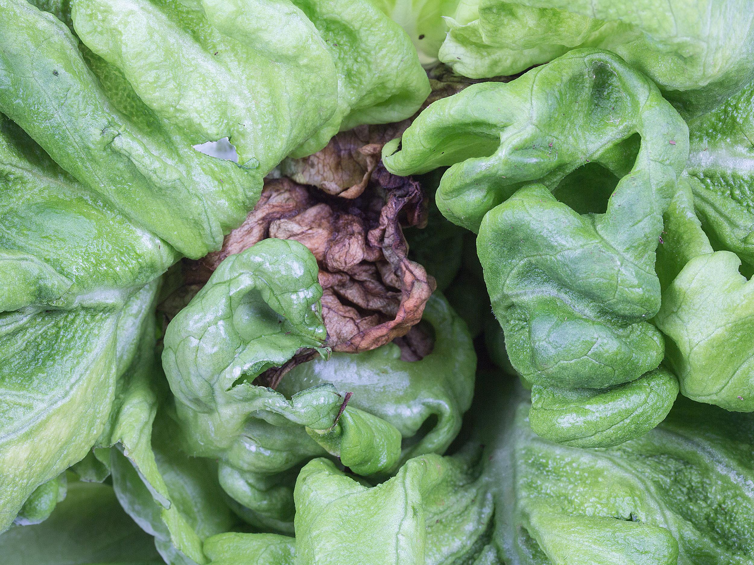 Une laitue Boston (cv 'Flandria') montre une malformation sévère des feuilles. Une vue rapprochée des feuilles du cœur montrent des tissus nécrosés. Les feuilles médianes et de la couronne montrent une marbrure jaune entre les nervures près de la marge du limbe. Les feuilles sont enroulées vers l’extérieur, épaisses, craquantes. Les nervures sont parfois blanchâtres. Les tests de laboratoire se sont avérés négatifs pour la détection de phytoplasme et de virus. Le champignon Olpidium sp. n’a pas été détecté des racines (virus des grosses nervures (MLBVV)). Les symptômes sont caractéristiques d’une carence en bore. Il est également possible que le MLBVV soit impliqué dans les symptômes (nervures jaunes) mais le vecteur n’a pas été observé dans les racines et nous ne possédons pas l’anticorps pour détecter ce virus.