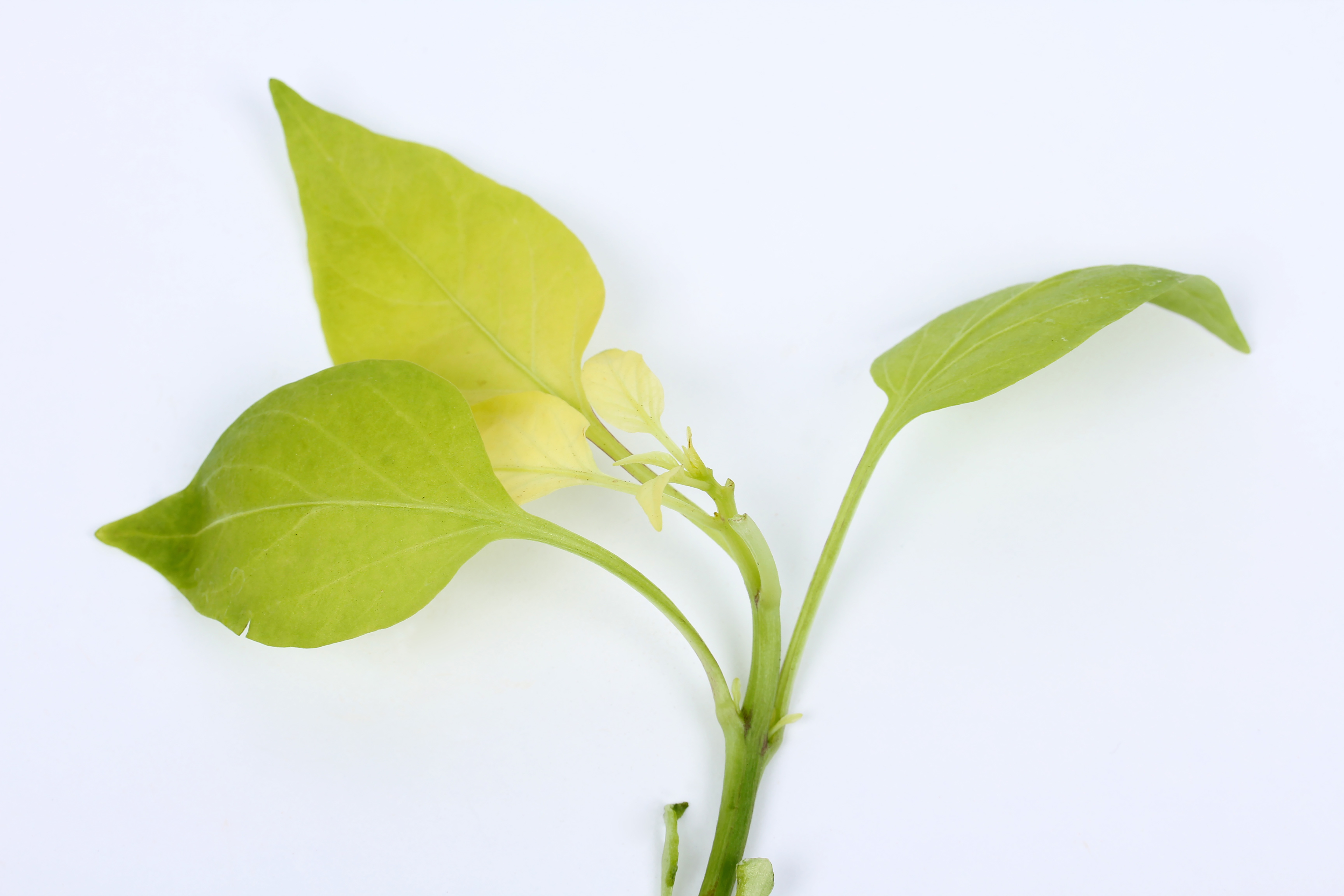 Sur un jeune plant de poivron (stade 5 feuilles), les feuilles terminales et médianes présentent un jaunissement prononcé. Le jaunissement débute à la base du limbe et affecte même les nervures. Les jeunes feuilles sont les plus affectées. L’extrémité de certaines racines est brune (non visible ici). Aucun virus ni champignon racinaire n’a été détecté. Le pH (6,6) et la conductivité électrique (8,1 mS/cm) du substrat sont trop élevés. Comme 95 % de la production est atteinte, il s'agit probablement d'un problème non parasitaire. Les symptômes foliaires s’apparentent à ceux d’une carence en fer.