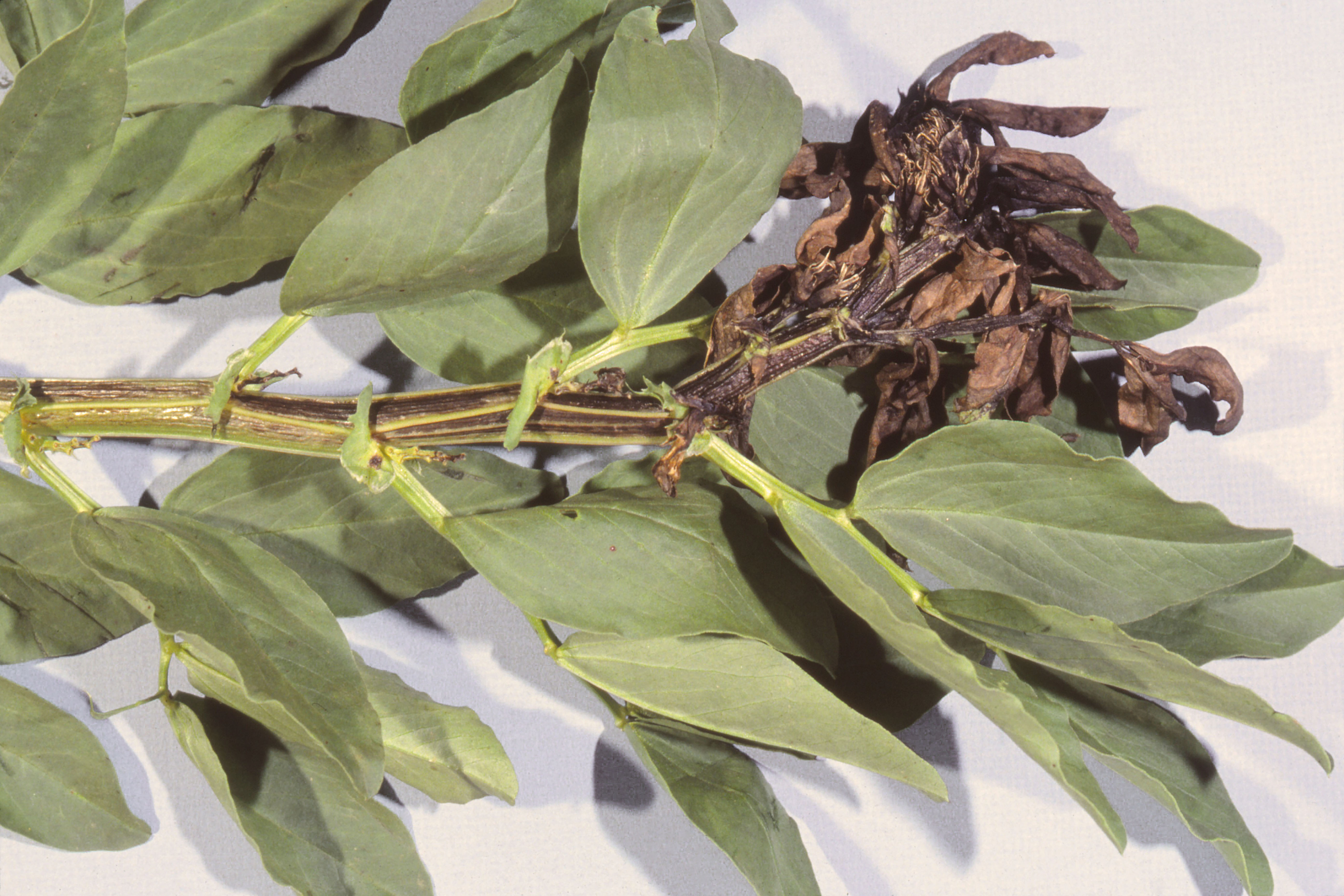 Les jeunes feuilles d’un plant de gourgane montrent une brûlure humide brune à noire. La tête du plant est flétrie. La tige est brune et les vaisseaux sont également affectés (non visible ici). Les tests de laboratoire se sont avérés négatifs pour la détection de bactéries et de champignons. Les symptômes sont causés par une température trop élevée de l’air (chaleur).