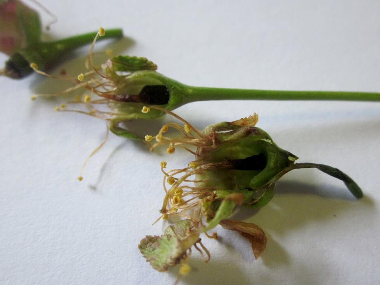 Pistils nécrosés sur des fleurs de cerisier nain rustique ayant subi un gel printanier.