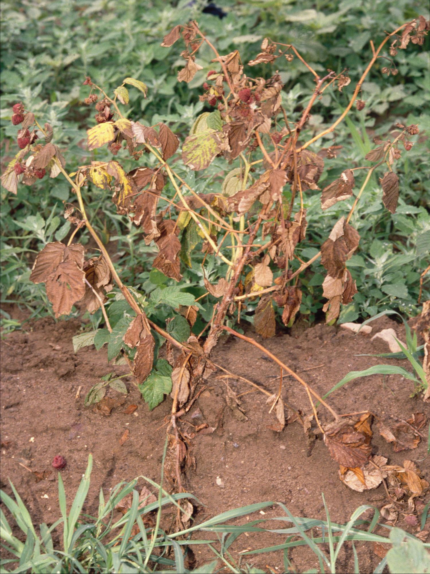 Une vue rapprochée d’un framboisier montre une tige fructifère dépérie avec des feuilles jaunies et des brûlures à la marge, entre les nervures et de tout le limbe. Ces symptômes sont caractéristiques du pourridié des racines chez le framboisier. Cette maladie est causée par Phytophthora rubi.