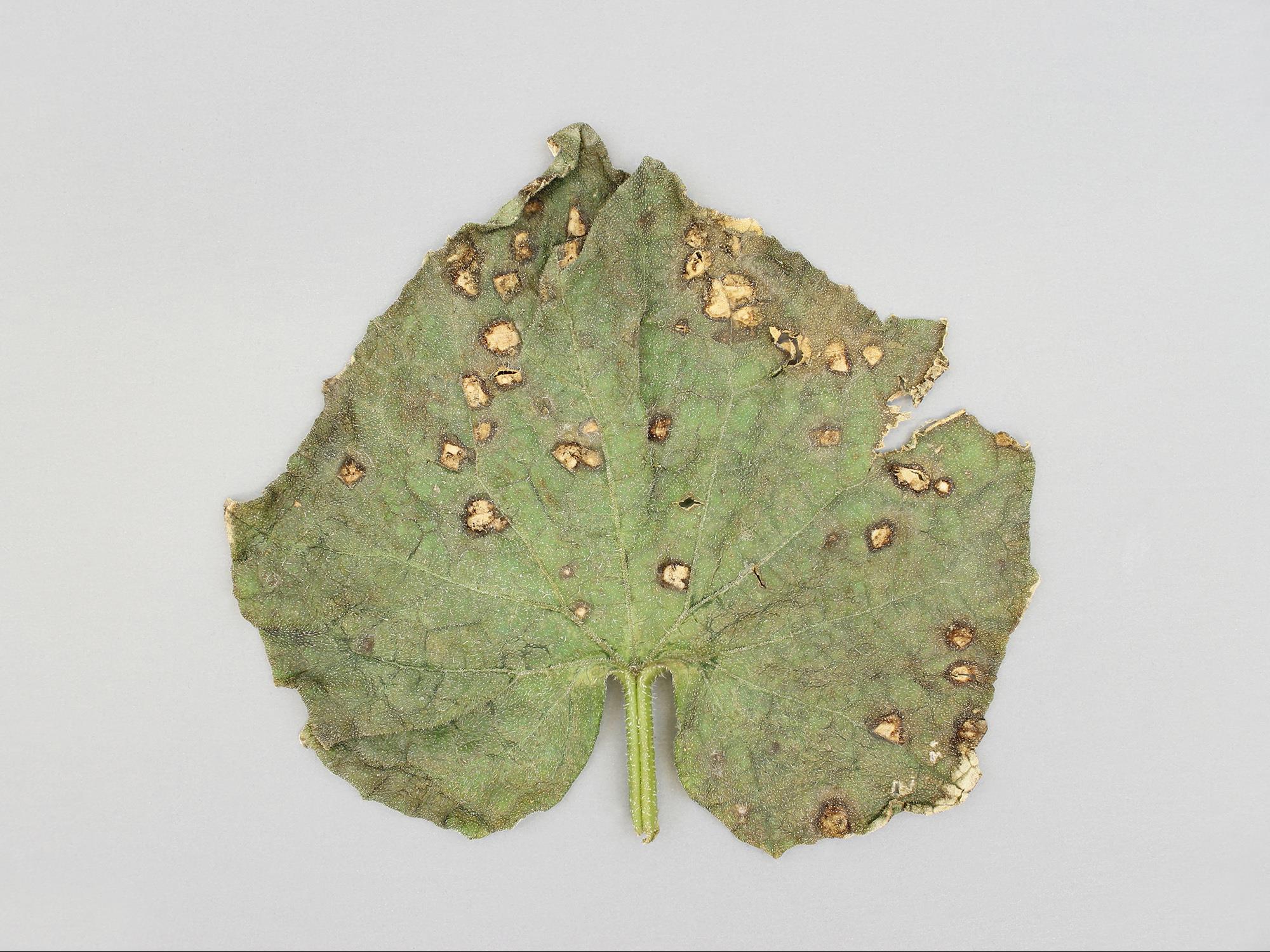 À la face supérieure d’une feuille de concombre de champ, présence de taches beiges, circulaires à légèrement angulaires, bien délimitées par une marge foncée. Leur dimension varie entre 1 et 5 mm. Il peut y avoir jusqu’à 30 taches par feuille. Les tests de laboratoire ont révélé la présence du champignon Alternaria alternata, responsable de la tache alternarienne des feuilles.