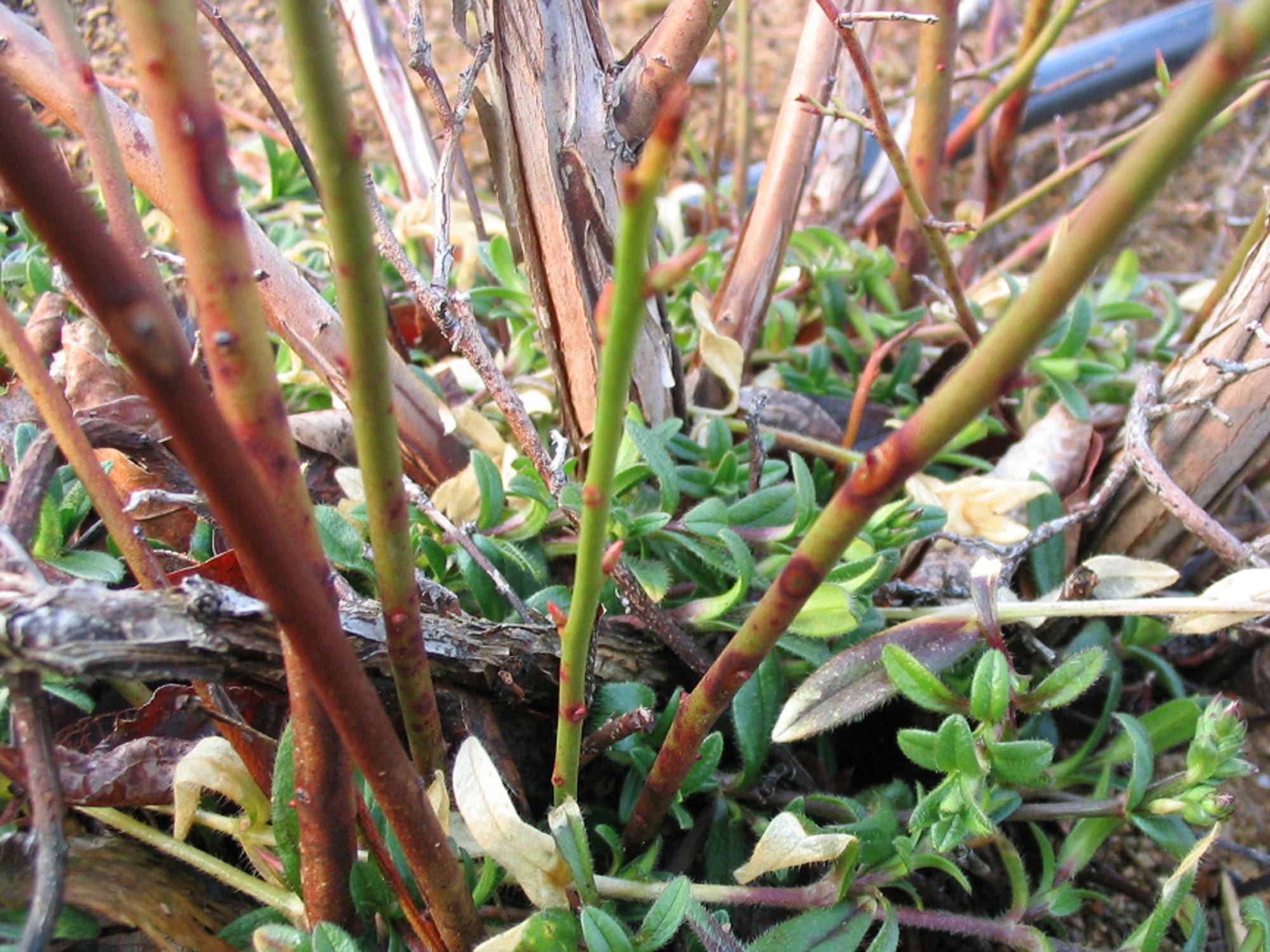 Dans la partie basale de jeunes tiges de bleuet en corymbe, présence de taches rougeâtres encerclant les cicatrices foliaires. Les taches évoluent progressivement en un chancre elliptique dont le centre est gris. Ce dommage est caractéristique et causé par le champignon Fusicoccum putrefaciens, responsable du chancre à Fusicoccum chez le bleuet en corymbe.