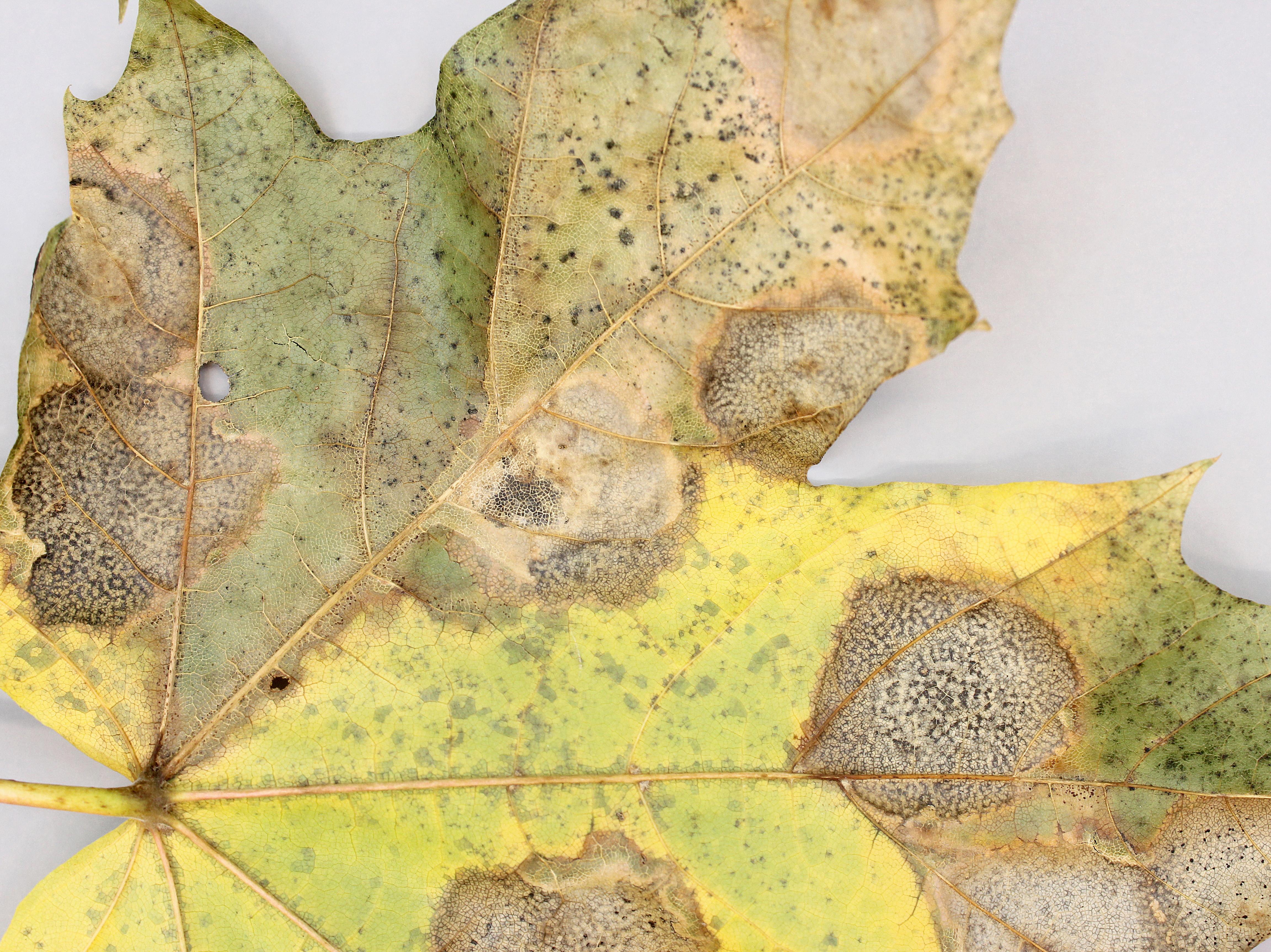 Taches à la face inférieure d'une feuille d'érable de Norvège