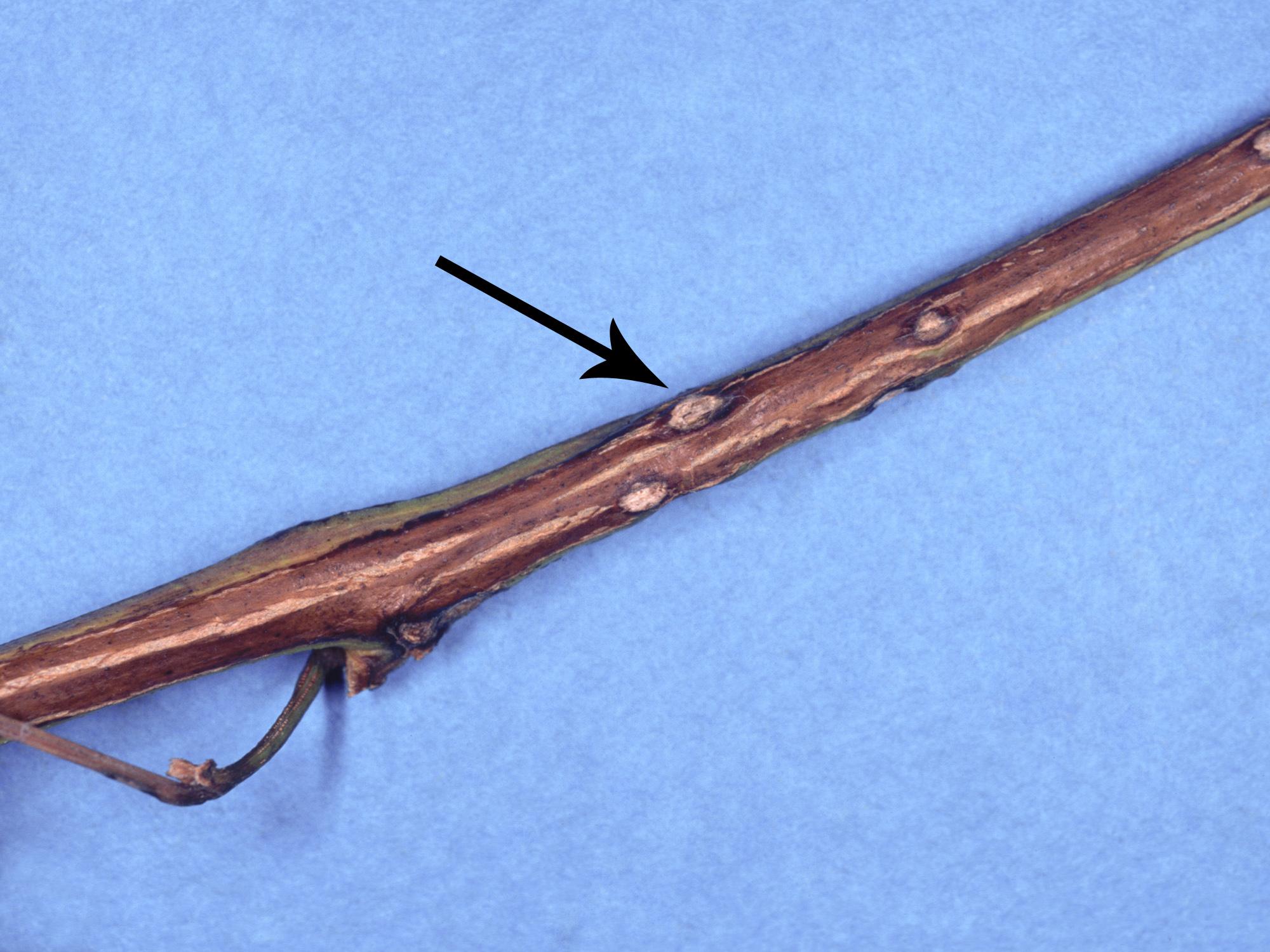 Sur une pousse annuelle d’un plant de vigne, présence de taches ovales, légèrement déprimées dont le centre est blanchâtre à grisâtre et la marge est étroite et noire (voir flèche). Les taches sont distribuées au hasard sur la tige. Les tests de laboratoire ont révélé la présence du champignon Elsinoe ampelina, responsable de l’anthracnose maculée chez la vigne.