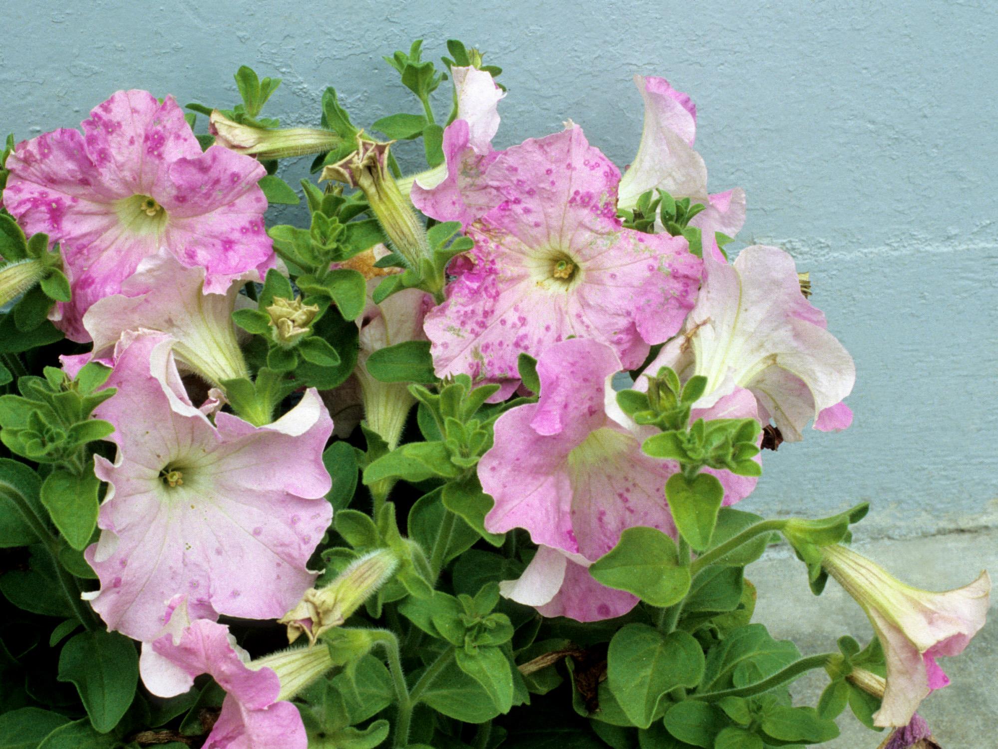 Sur les pétales de plants de pétunias cultivés en caissette, présence de nombreuses petites taches blanchâtres, délimitées par un large halo mauve. Les taches sont de différentes grosseurs et réparties principalement à la marge des pétales. Ces symptômes sont causés par le champignon Botrytis cinerea, responsable de la moisissure grise.