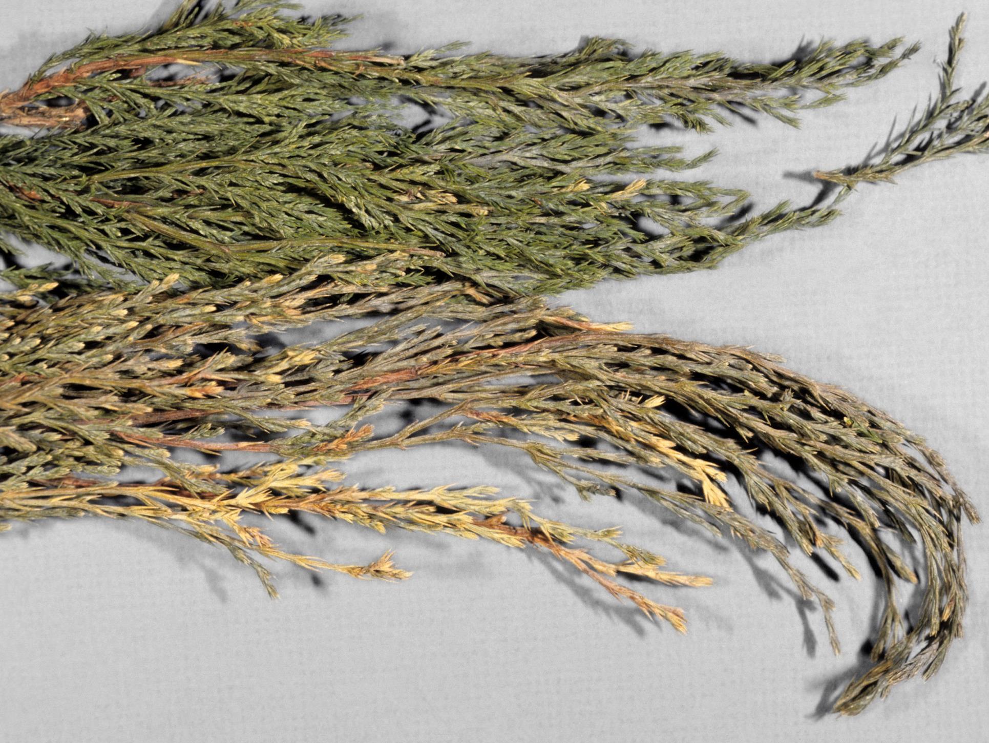 Comparaison entre une pousse de genévrier saine et affectée