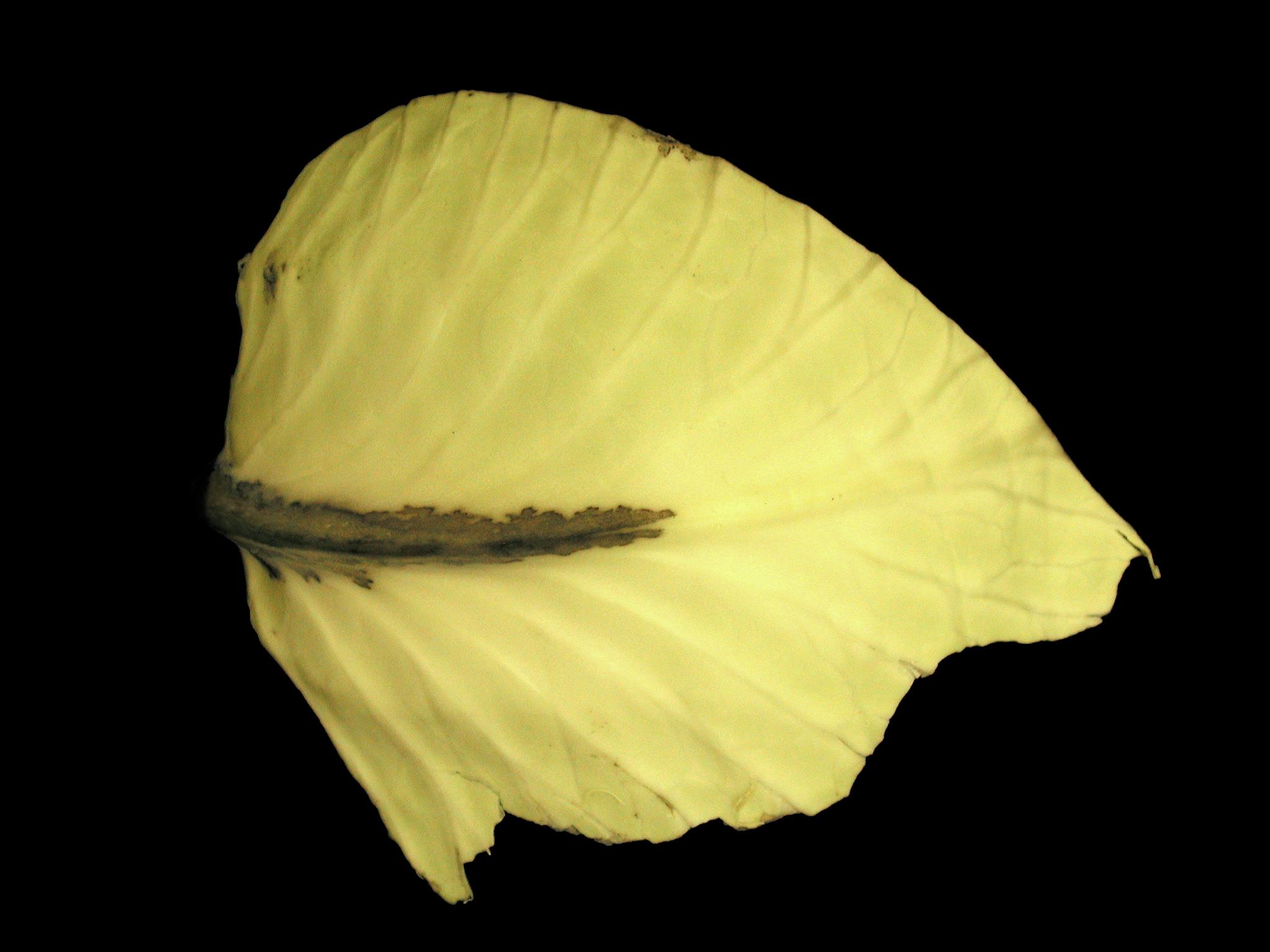 Sur un chou pommé (cv 'Loughton') provenant d’un entrepôt la pourriture débute à la base de la feuille, au point d’attache sur la tige, et progresse ensuite sur le limbe en longeant la nervure principale. Le Service national d'identifications fongiques d'Agriculture et Agroalimentaire Canada (AAC) a identifié Phytophthora brassicae, l'agent pathogène responsable de la pourriture en entreposage chez les crucifères.