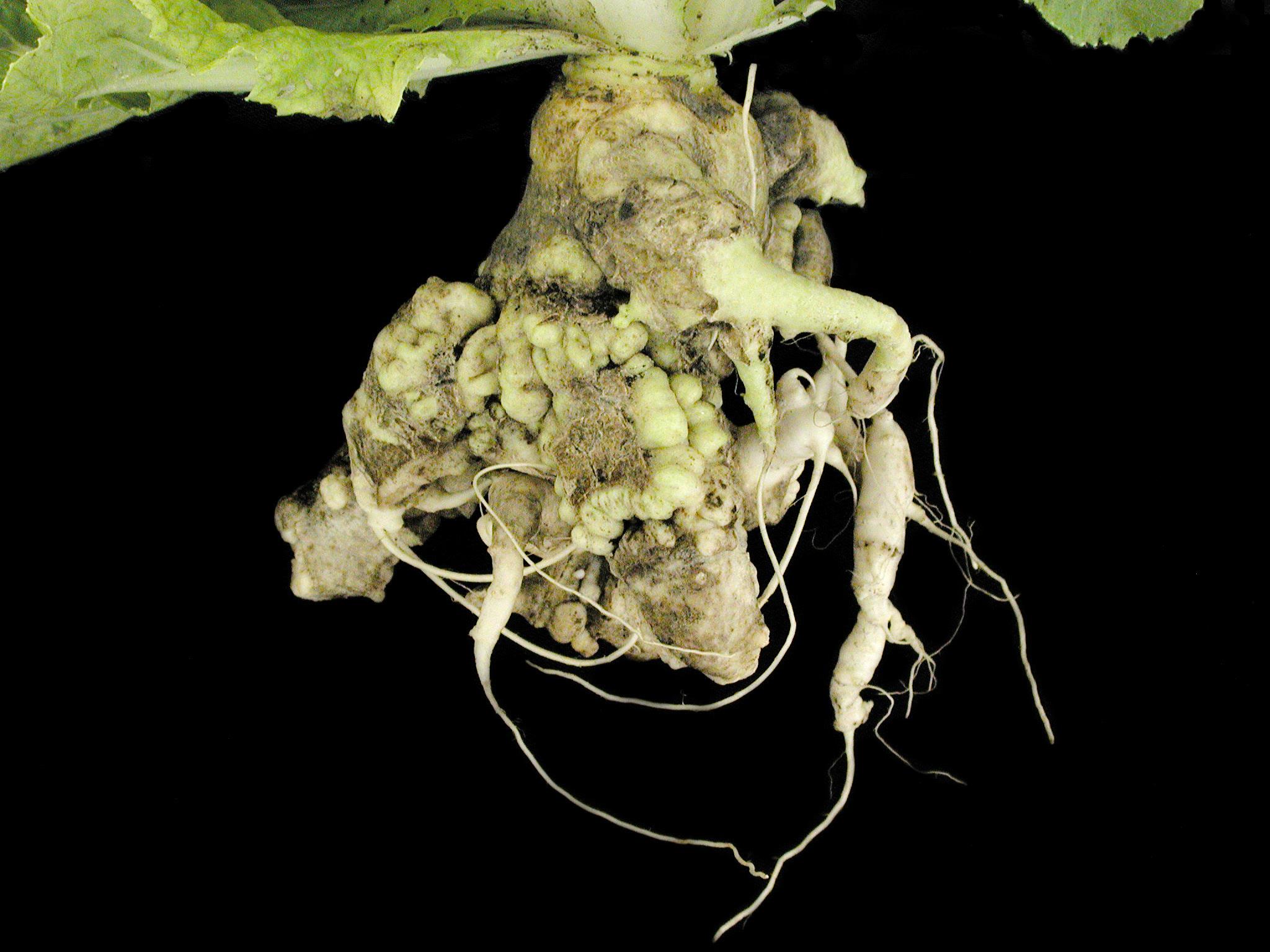 Une vue rapprochée d’un plant de chou chinois montre un système racinaire complètement déformé. Le système racinaire est composé de nombreuses tumeurs blanches et fermes, de formes et de tailles variées. Le test de biologie moléculaire (PCR) a révélé la présence du champignon Plasmodiophora brassicae, responsable de la hernie des crucifères. Le conseiller agricole mentionne que 90 % des plants cultivés en terre noire présentent ces symptômes et ne sont pas commercialisables.