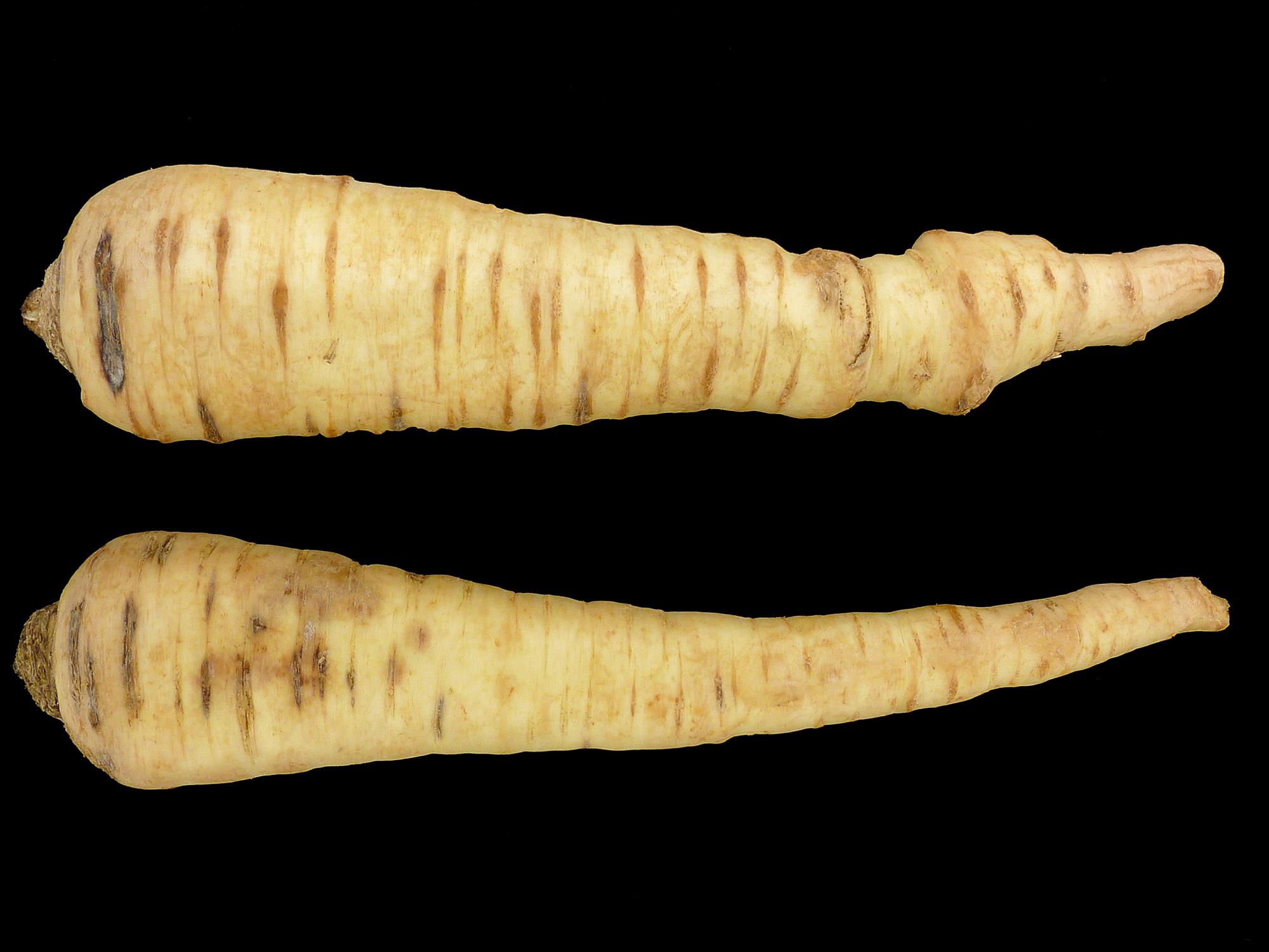 Dans la partie supérieure des panais provenant d’un entrepôt, présence de lésions brunes à noires, de forme allongée, sur les lenticelles. Parfois les lésions s’étendent pour rejoindre plusieurs lenticelles. Les tests de laboratoire ont révélé la présence du champignon Itersonilia perplexans, responsable du chancre à Itersonilia chez le panais. Notez que des dommages causés par la mouche de la carotte (Psila rosae) ont également été observés dans la partie basale des racines.