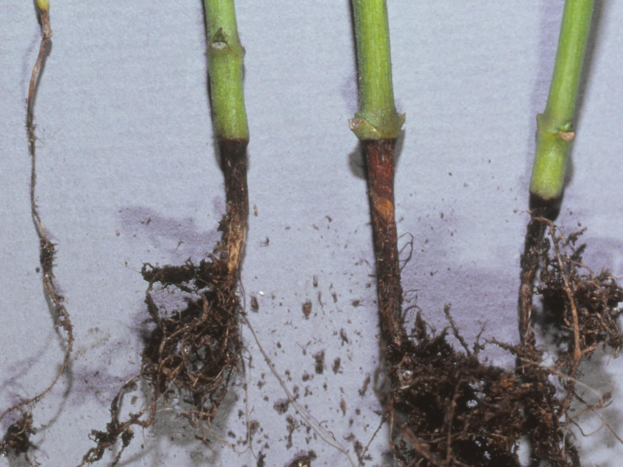 De jeunes plants de poivron de serre montrent une constriction et un chancre brun à noir, plutôt sec, au collet. Les observations microscopiques ont révélé la présence du champignon Rhizoctonia solani, responsable de la fonte des semis chez le poivron.
