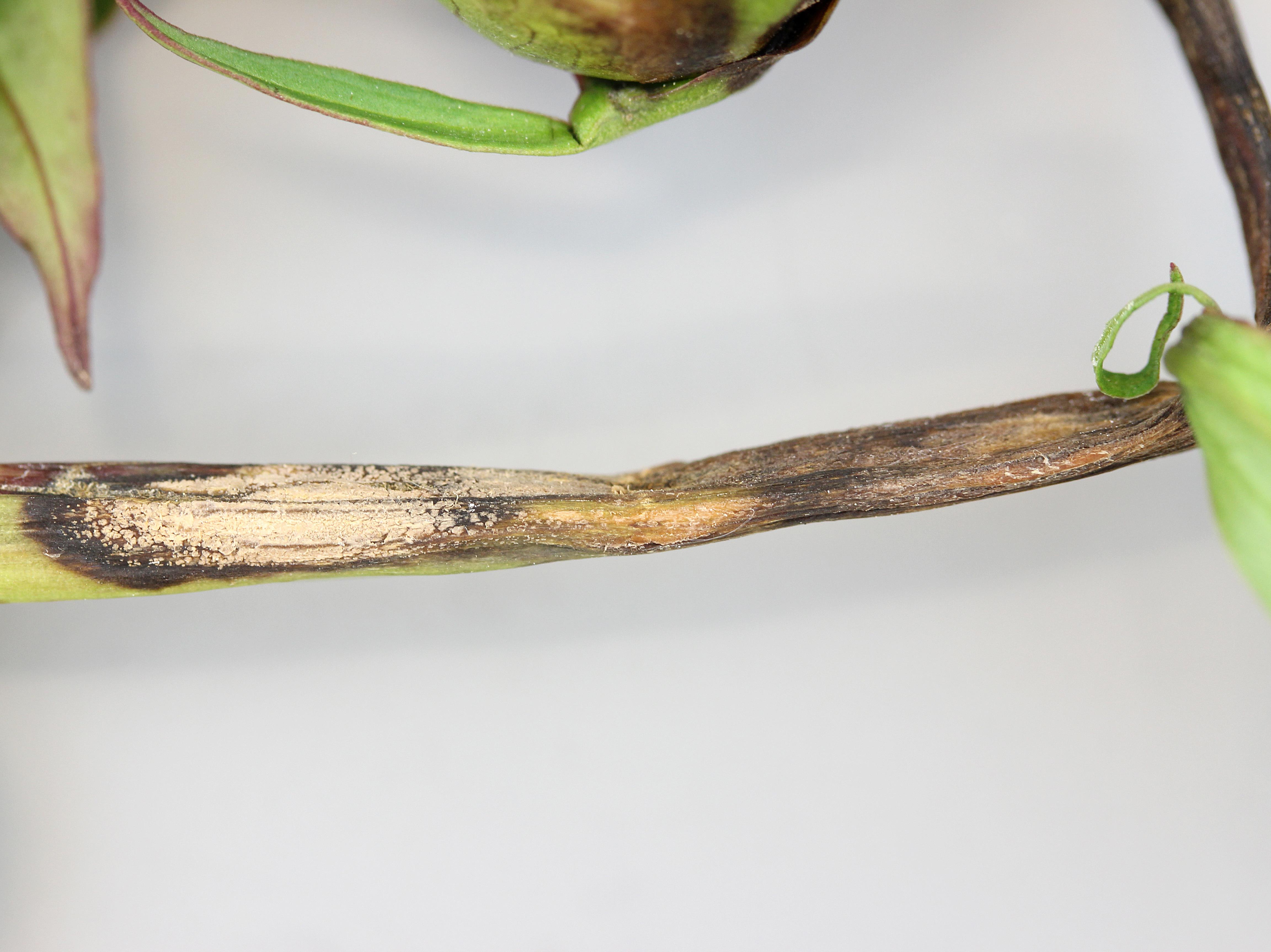 Une vue rapprochée du pédoncule d’une fleur de pivoine montre une brûlure et des fructifications fongiques. Les observations microscopiques ont révélé la présence de conidies du champignon Gloeosporium sp., responsable de l’anthracnose chez la pivoine.