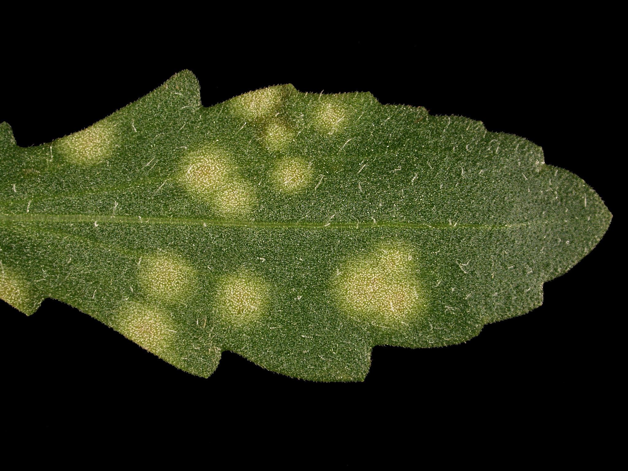 Une feuille d'une gaillarde hybride (cv 'Bijou') cultivée en serre montre des taches circulaires blanches, d’un diamètre moyen de 5 mm. La maladie est plus sévère sur les vieilles feuilles. Les observations microscopiques ont révélé la présence du champignon Entyloma sp., responsable du charbon foliaire.