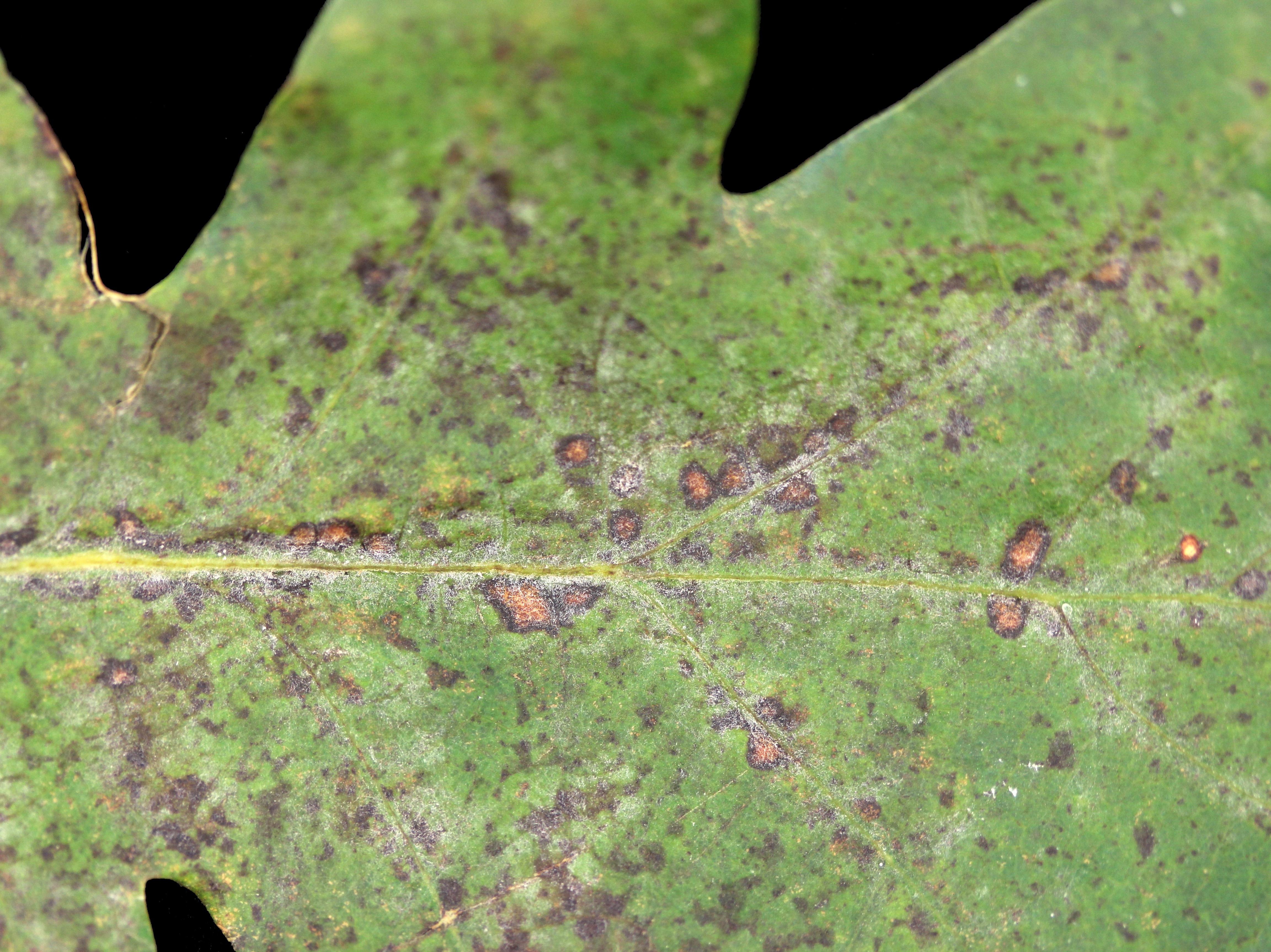 Une vue rapprochée de la face supérieure d’une feuille de chêne (cv 'Argenteo Marginata') montre la présence de deux types de taches. La majorité des taches sont brun noir et très fines et quelques-unes sont beige brun avec une marge foncée, se rapprochant de la brûlure. Un fin mycélium blanchâtre est accolé au limbe. Les observations microscopiques ont révélé la présence de conidiophores portant de longues chaînes de conidies caractéristiques d’un champignon causant la maladie du blanc (oïdium). Il s’agit probablement d’Erysiphe alphitoides, rapporté chez le chêne pédonculé.