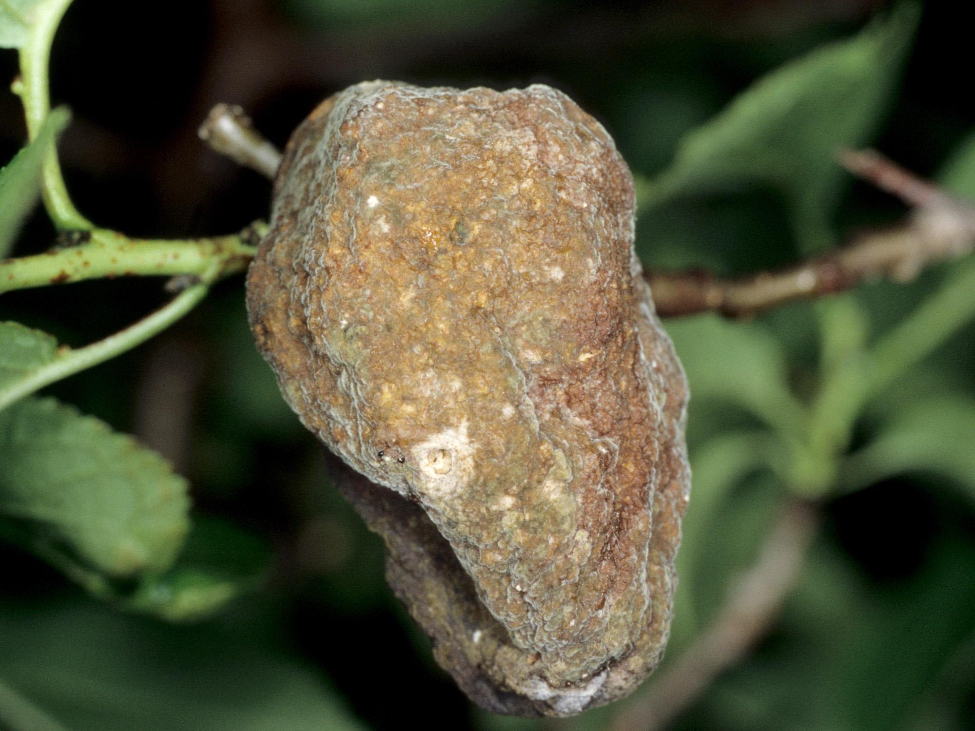 Une prune est brune, desséché et de forme allongée. Le fruit commence à se couvrir d’une pruine blanchâtre à grisâtre. Ces symptômes sont causés par le champignon Taphrina pruni, responsable de la maladie des pochettes chez le prunier.
