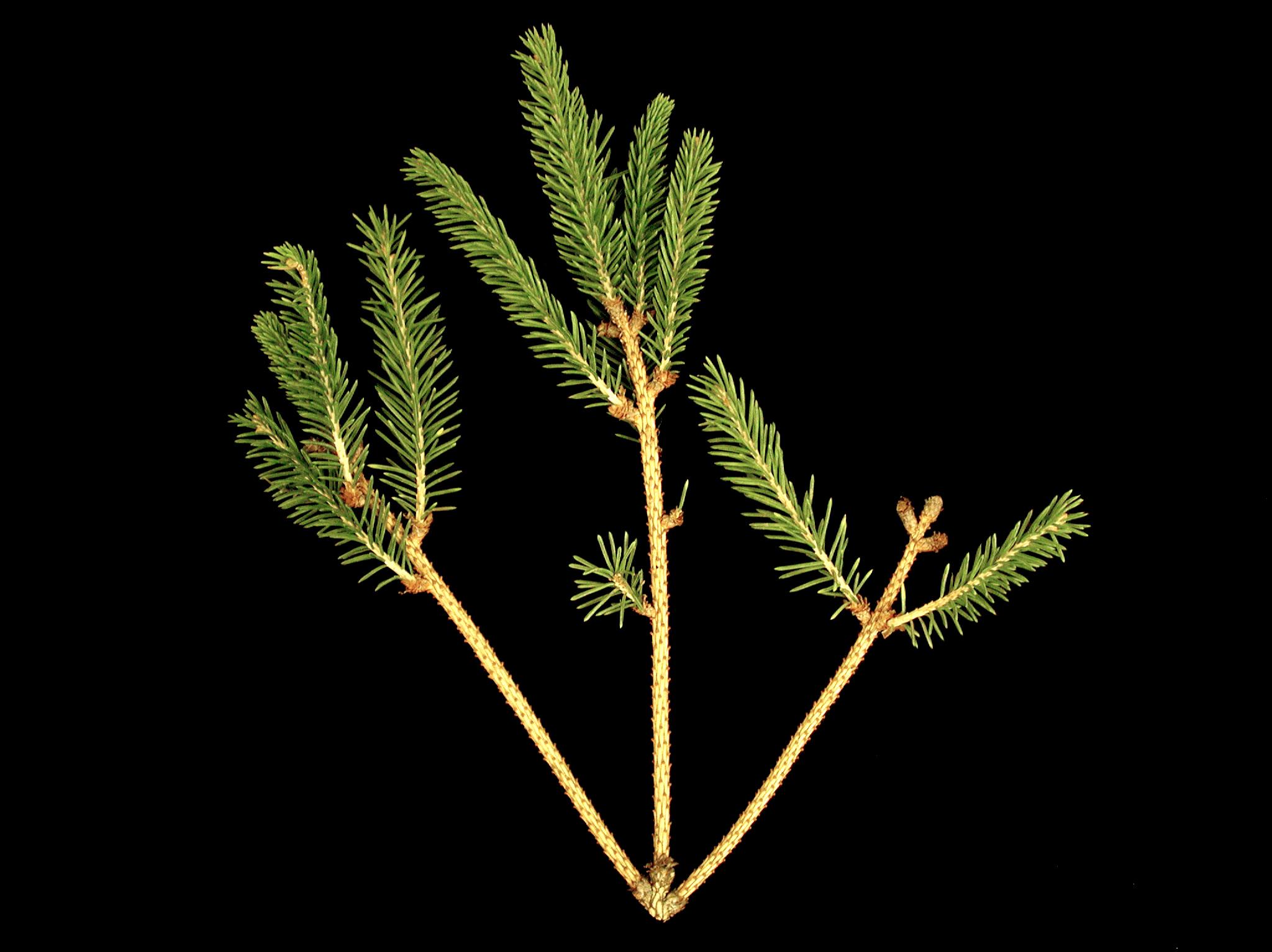 Sur un rameau d'épinette blanche, les aiguilles de deuxième année sont tombées. Les aiguilles de l’année sont souvent courtes et trapues, mais toujours vertes. Les rares aiguilles observées sont de couleur brique avec des points noirs alignés à la face inférieure. Le bois sous l’écorce apparaît graduellement brun clair (non visible ici). Les observations microscopiques ont révélé la présence de pycnides et de conidies du champignon Rhizosphaera sp., responsable des rouges des conifères. Il s’agit probablement de Rhizosphaera kalkhoffii, l’espèce la plus fréquemment rapportée chez l’épinette blanche.