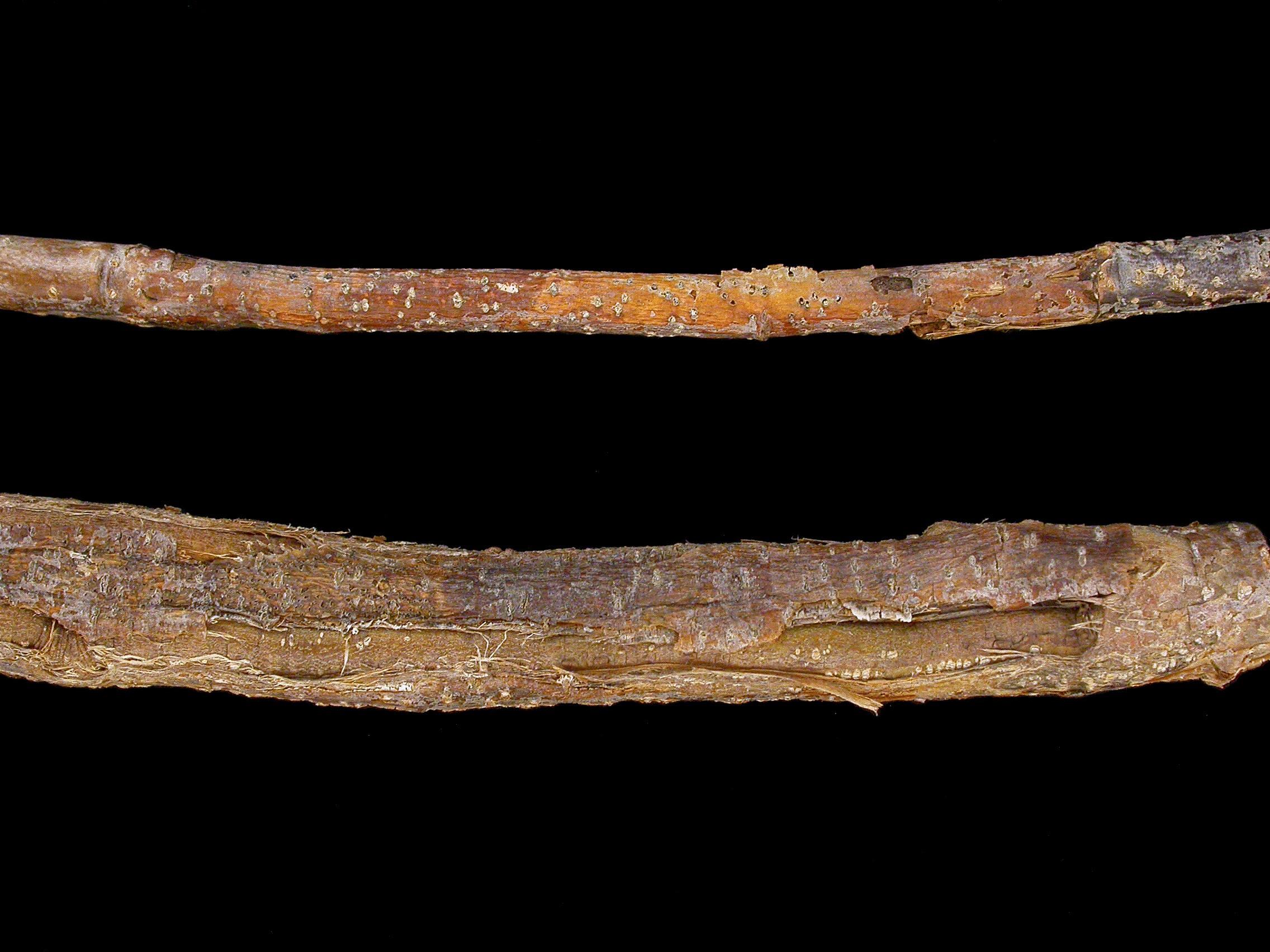 Une branche de pommier montre un long chancre déprimé sur plusieurs centimètres de longueur faisant crevasser l’écorce sur tout un côté de la branche. Il y a des bourrelets de tissus cicatriciels de chaque côté de ce chancre et des pycnides noires émergent de l’écorce. Le chancre sur la tige du haut est moins développé. Les tests de laboratoire ont révélé la présence du champignon Diaporthe perniciosa (syn. Phomopsis mali), responsable du chancre phomopsien chez le pommier.