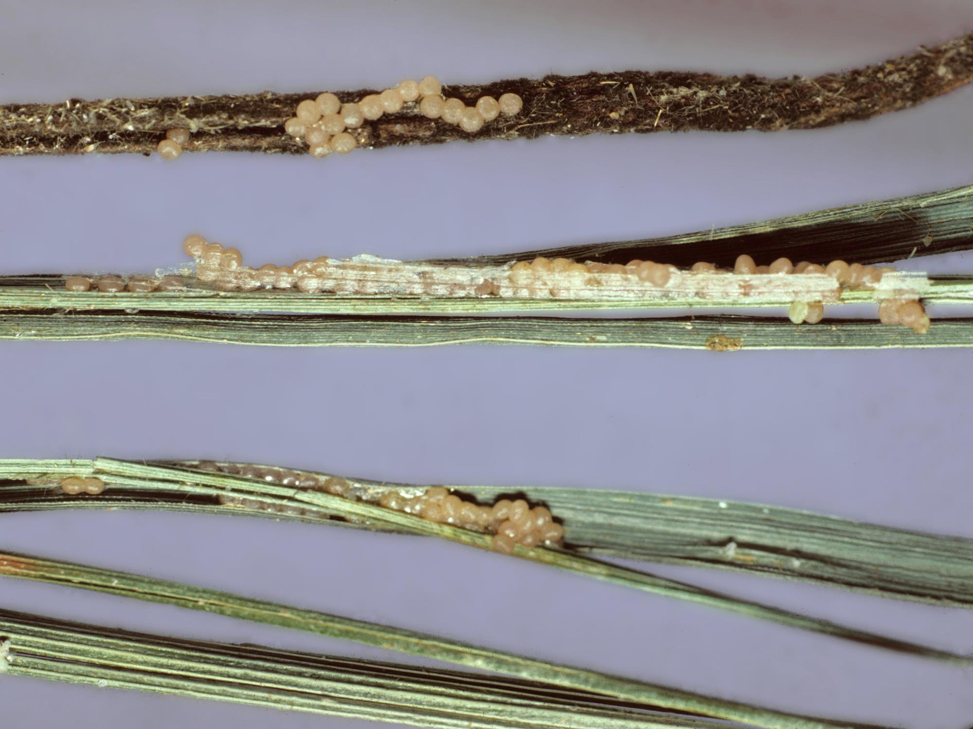 Fructifications fongiques beiges sur feuilles de gazon