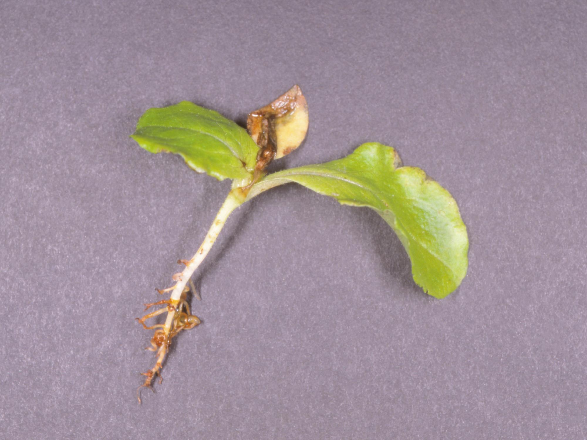 Une plantule de laitue de serre montre un jaunissement des feuilles et un brunissement important des racines. Le brunissement débute à l’extrémité de la racine principale et des racines secondaires. Les tests de laboratoire ont révélé la présence de Pythium sp. dans les racines.