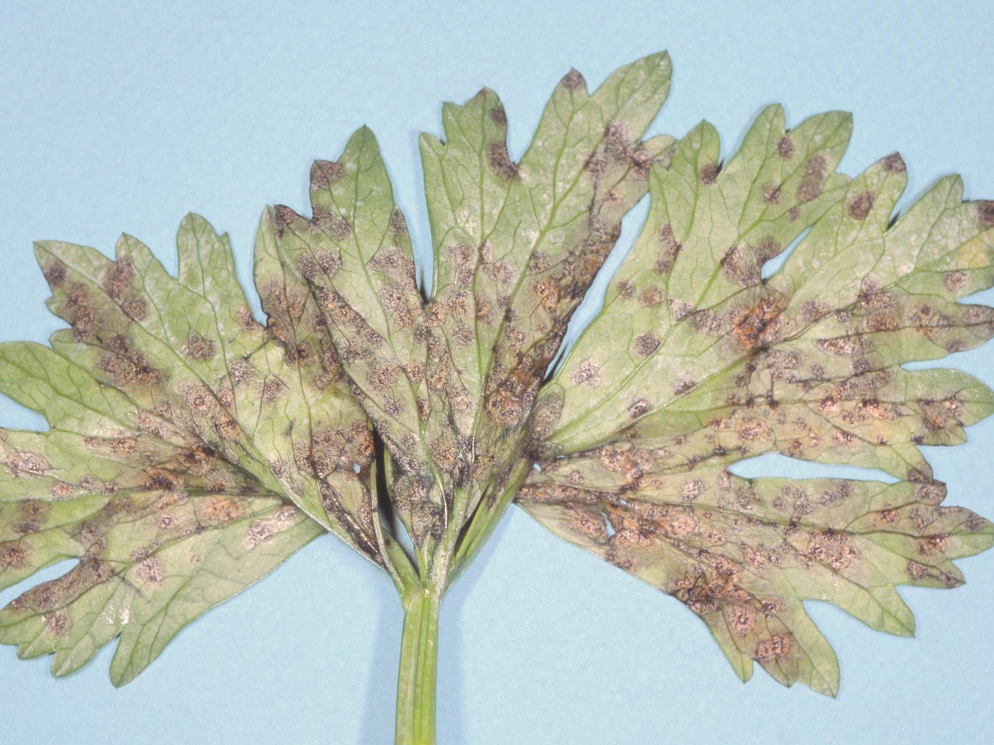 Une feuille de céleri montre de nombreuses taches beiges, plutôt circulaires, portant de minuscules ponctuations noires. Les observations microscopiques ont révélé la présence du champignon Septoria apiicola, responsable de la tache septorienne chez le céleri. Les plants affectés sont distribués en foyer au champ.