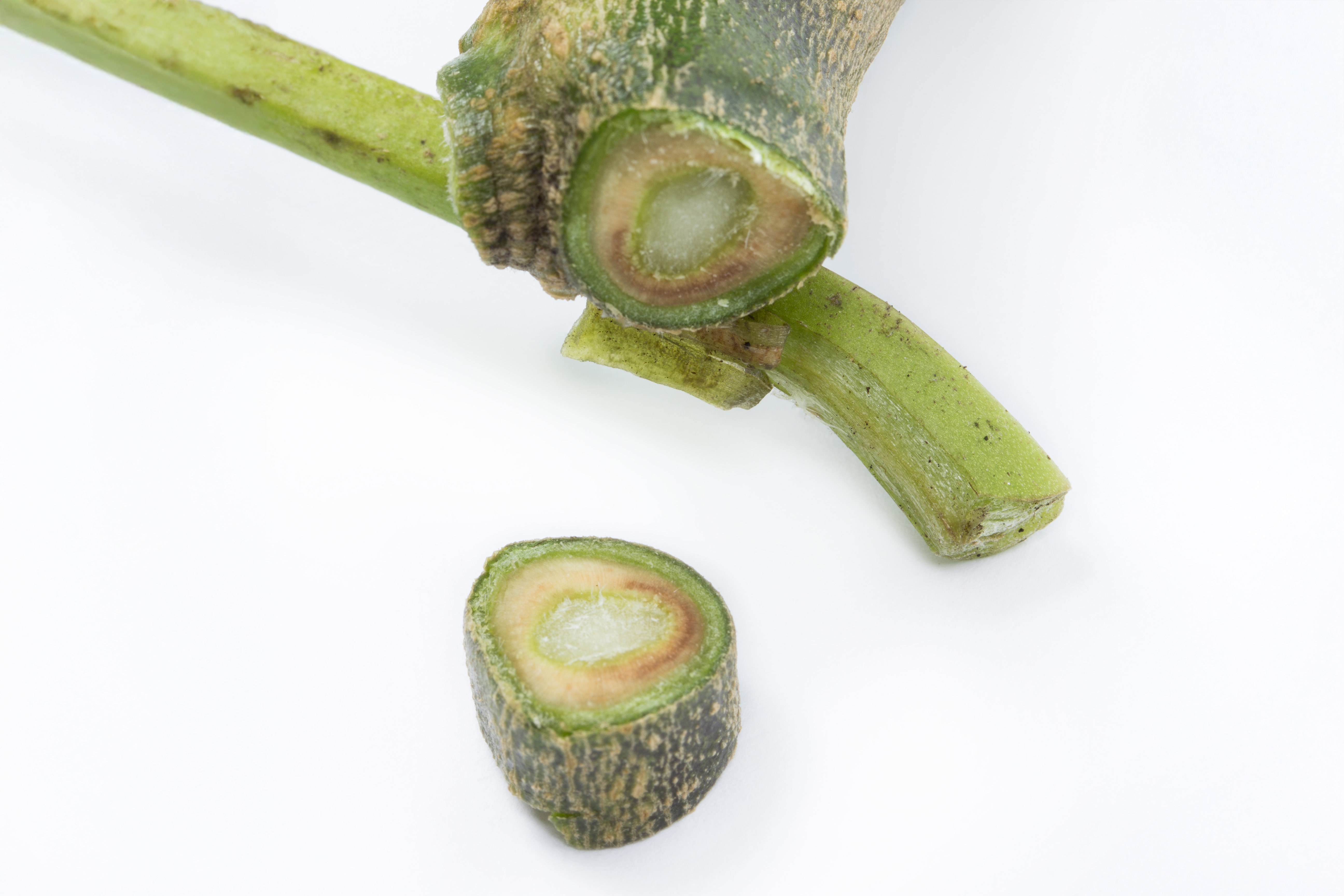 Le collet d’un plant d’aubergine montre un brunissement localisé du système vasculaire. Les feuilles étaient jaunes puis devenaient brunes sur un seul côté du limbe (non visible ici). Les tests de laboratoire ont révélé dans le collet la présence du champignon Verticillium sp., responsable de la verticilliose. Il s’agit probablement de V. dahliae. Ce champignon est également responsable des symptômes observés sur les feuilles.