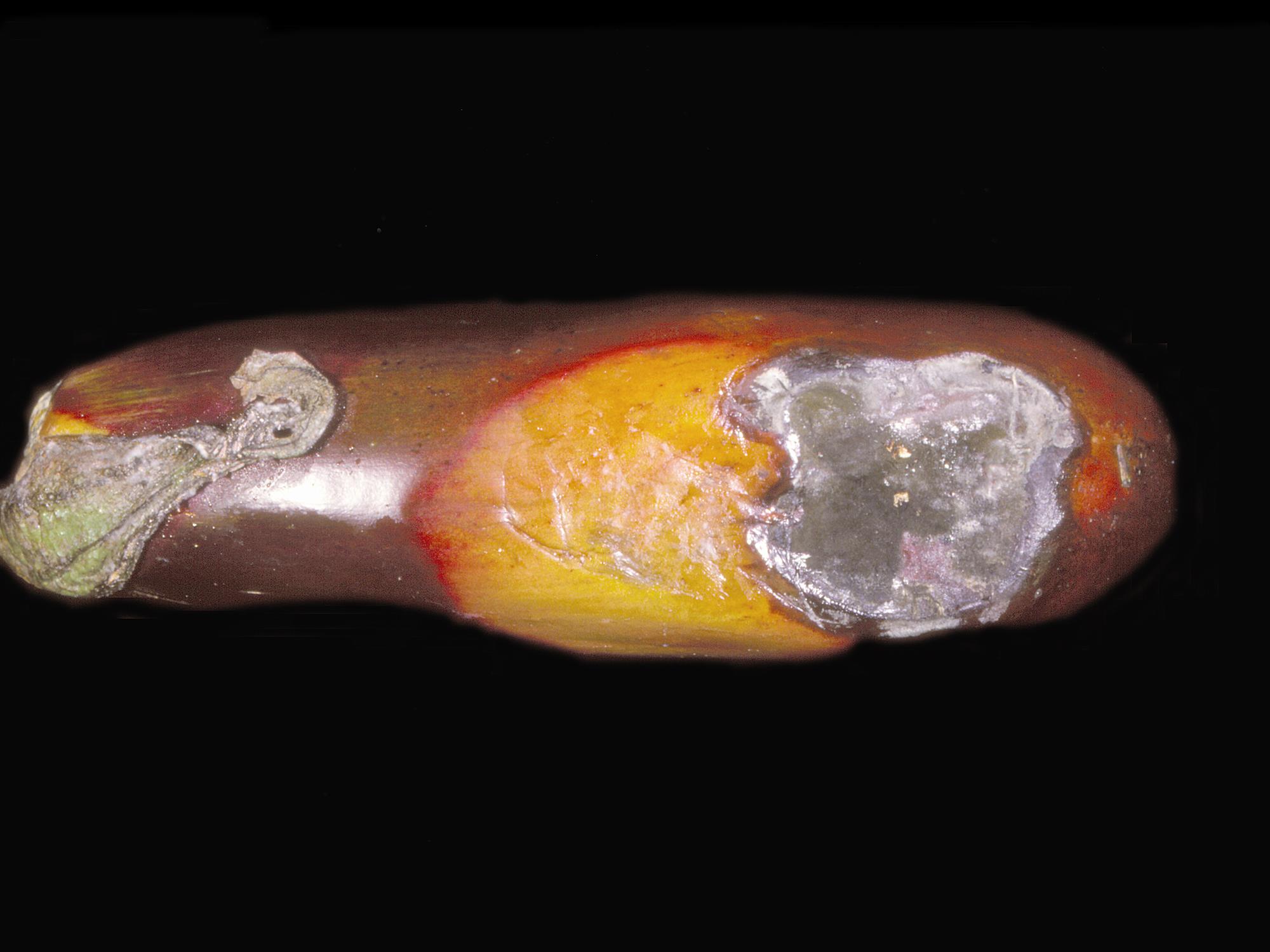 Une aubergine montre une grande plage déprimée couverte d’un mycélium noirâtre. Les observations microscopiques ont révélé la présence du champignon Alternaria alternata, responsable de la pourriture alternarienne du fruit.