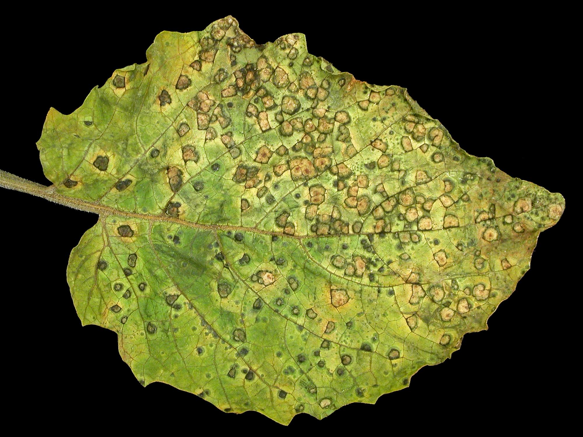 À la face supérieure d'une feuille de cerise de terre, présence de taches circulaires beiges à brunes. Les observations microscopiques ont révélé la présence du champignon Entyloma sp., responsable du charbon chez la cerise de terre. Il s’agit probablement d’Entyloma australe.