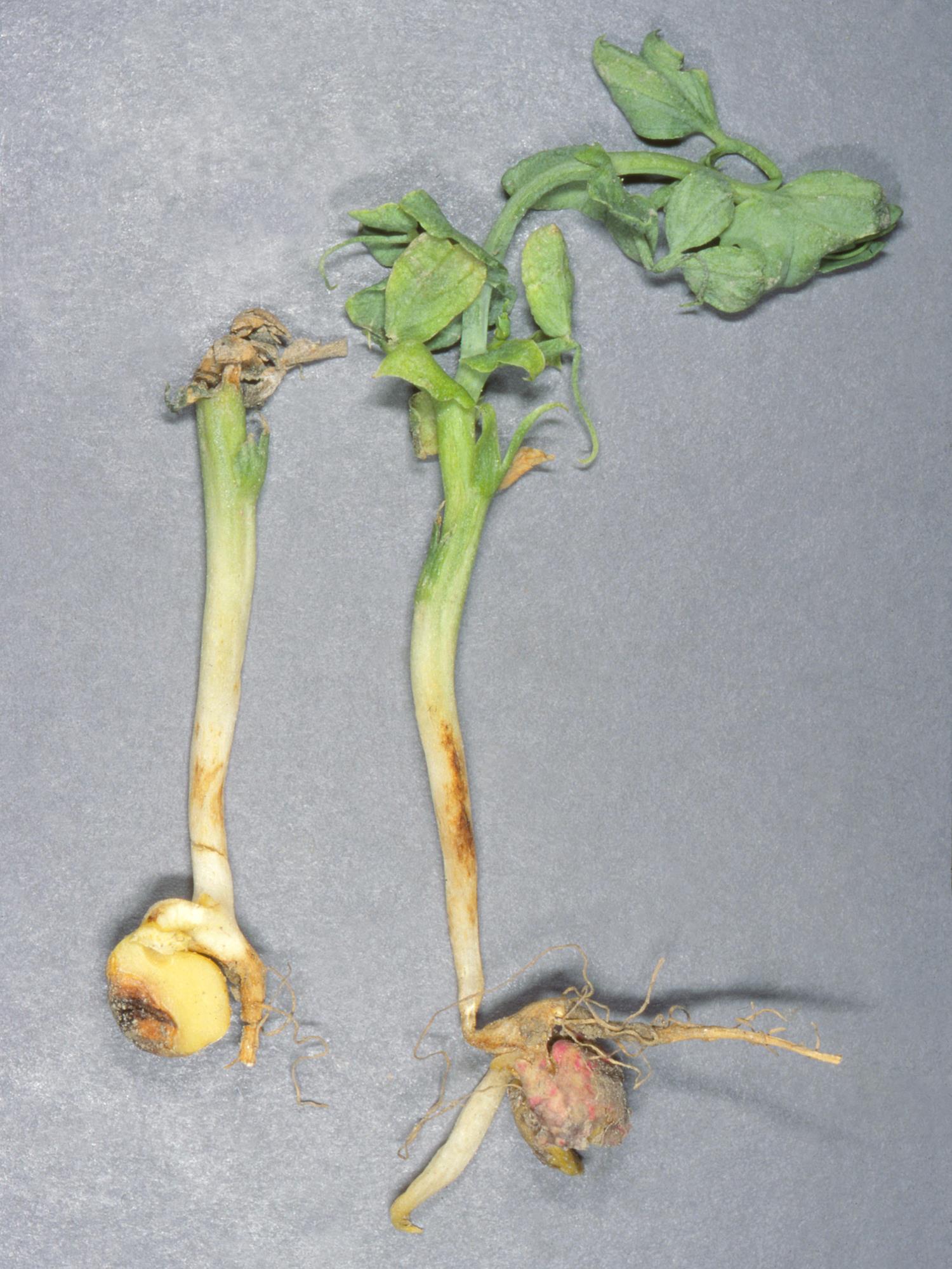 Des plantules de pois montrent une coloration brune sur l’épicotyle. Les tests de laboratoire ont révélé la présence du champignon Fusarium solani, responsable de la pourriture fusarienne des racines chez le pois. Il s’agit probablement de F. solani f. sp. pisi.