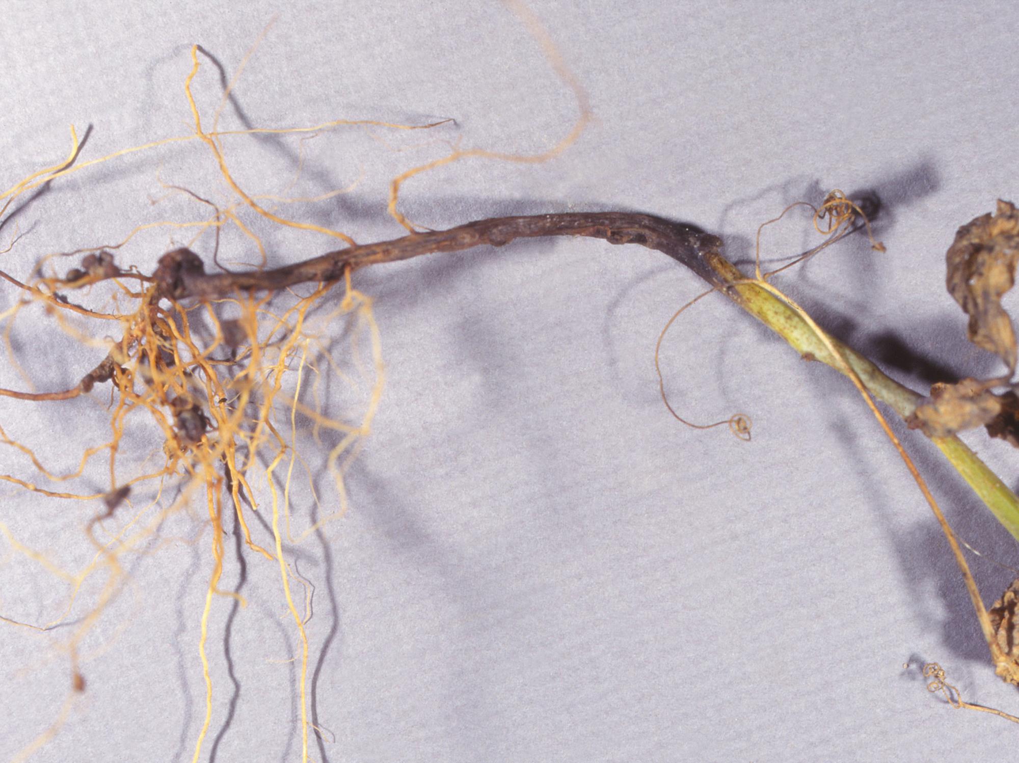 Un plant de pois montre une pourriture du pivot racinaire, des radicelles, du collet et de la partie basale de la tige. Les feuilles basales sont brûlées et le reste du feuillage était vert pâle (non visible ici). Les nodules étaient bruns. Les tests de laboratoire ont révélé la présence du champignon Aphanomyces euteiches, responsable de la nécrose racinaire précoce (pourriture des racines) chez le pois. Notez que le champignon Fusarium sp. a également été isolé des racines.