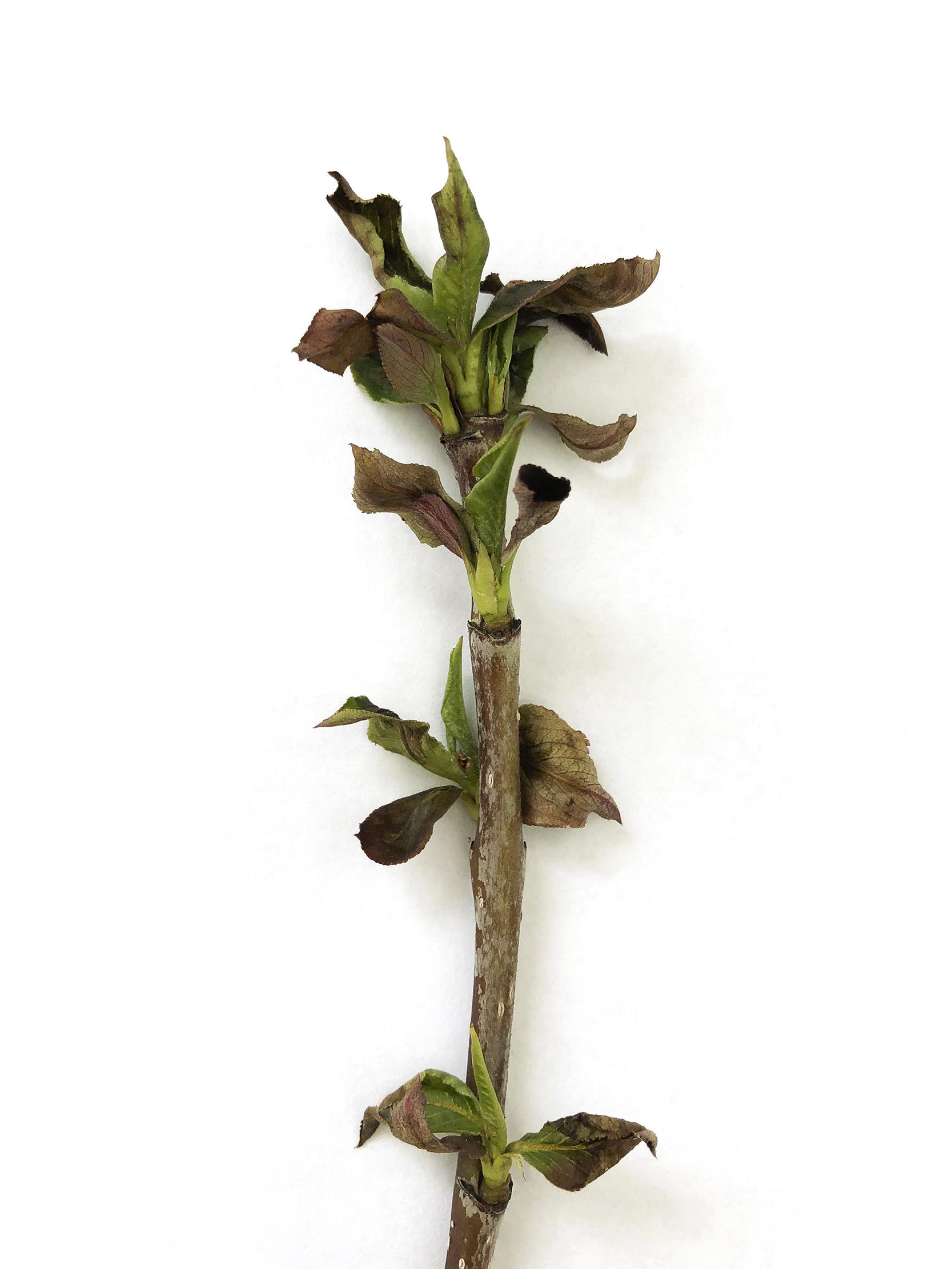 Feuilles qui flétrissent et brunissent durant le débourrement au printemps. Les tiges sont atteintes du chancre cytosporéen à la suite de dommages de gel hivernal.