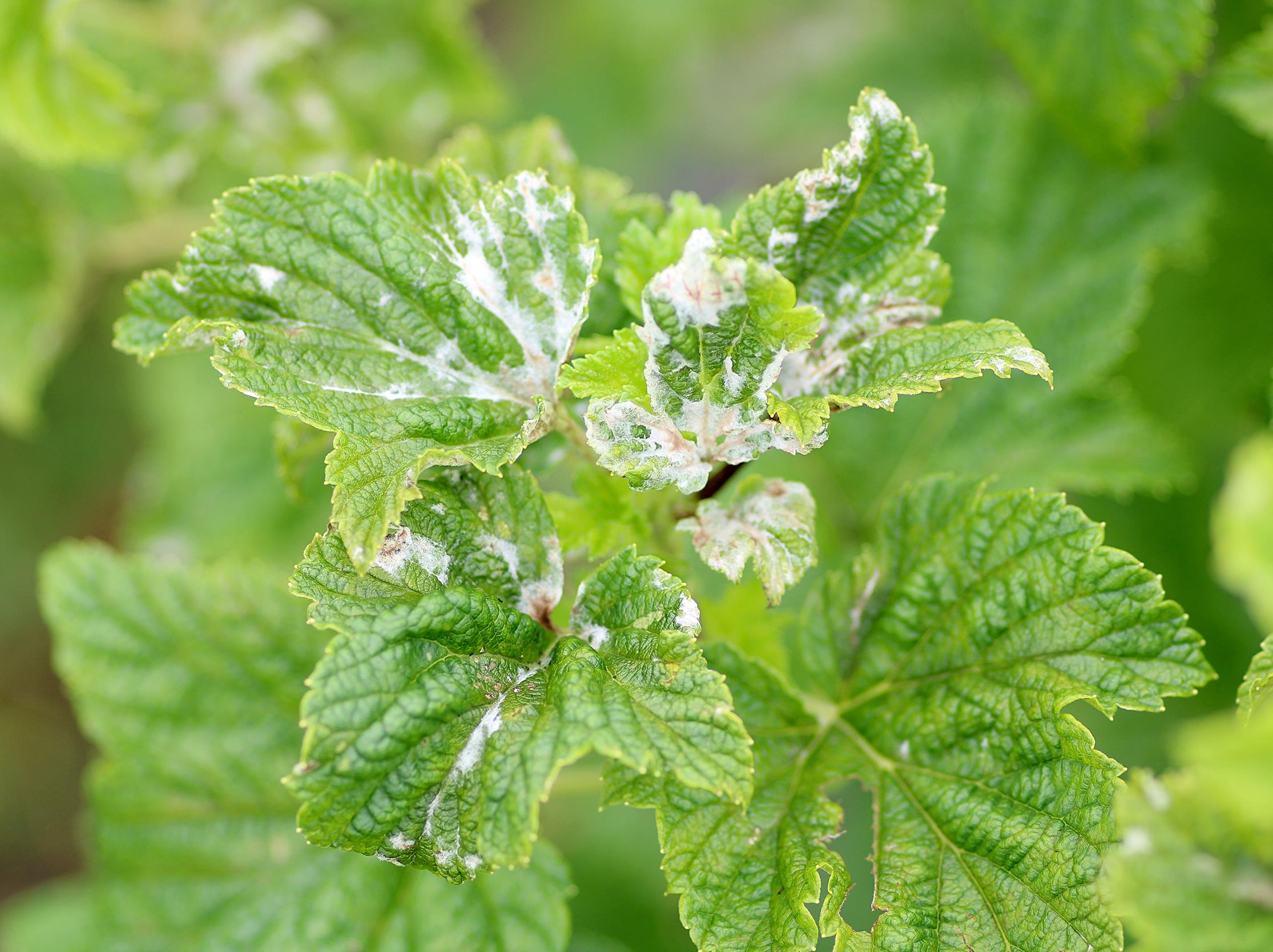 Duvet blanc et épais sur la face supérieure des feuilles terminales d’une tige de cassis en juillet.