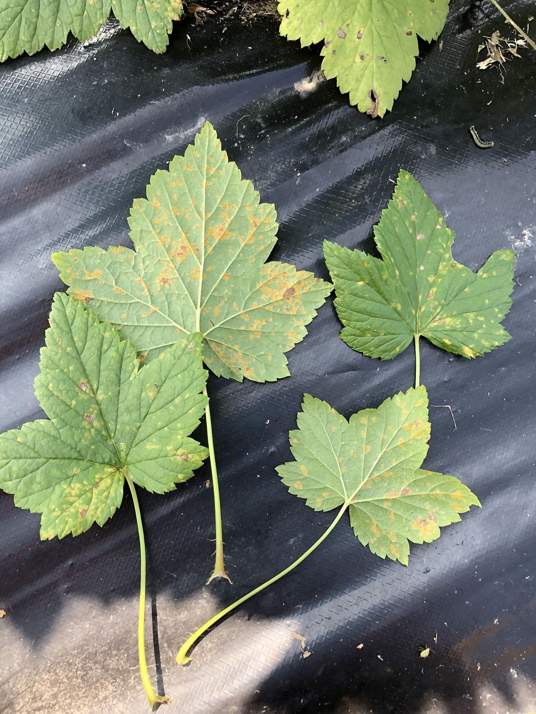 Ces feuilles de cassissier sont atteintes par la rouille vésiculeuse du pin blanc. Des taches jaunâtres sont présentes à la face supérieure et des taches duveteuses orangées à la face inférieure des feuilles.