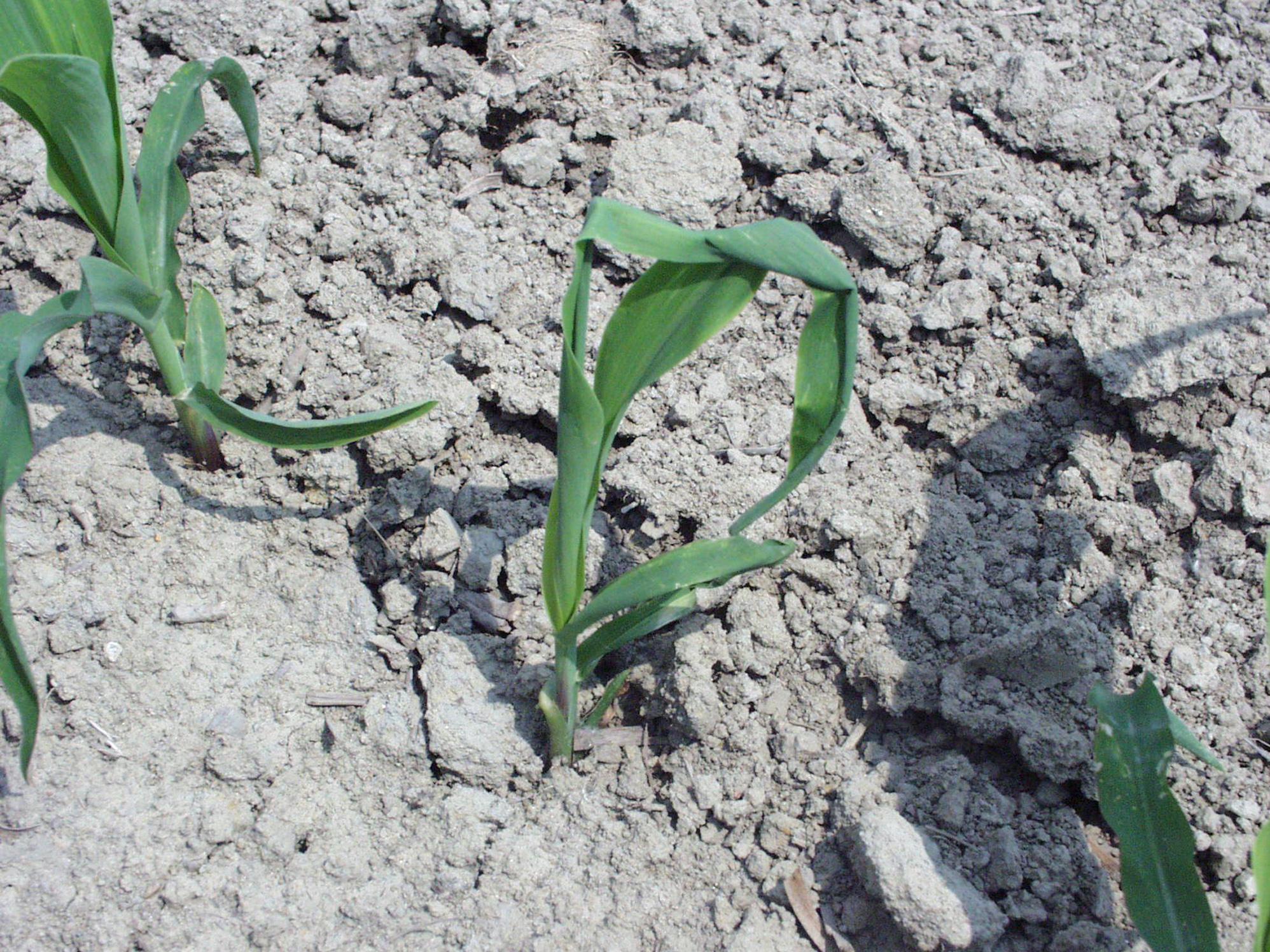 Les feuilles de maïs grains sont gaufrées et parfois enroulées. Le conseiller agricole mentionne que les dommages sont attribuables à une surdose de l’herbicide FRONTIER MAX (diméthénamide-P).