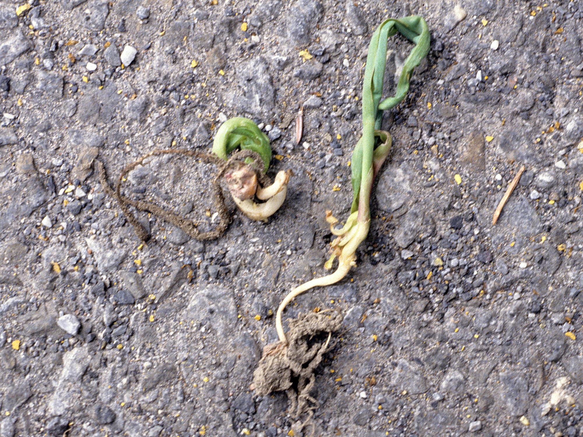 Les plantules de maïs grain et fourrager sont déformées et leur croissance est inhibée. Les feuilles sont enroulées sur elles-mêmes et le système racinaire est peu développé et parfois pourri (peu visible ici). Le semis trop superficiel a exposé les semences à l’herbicide dicamba.
