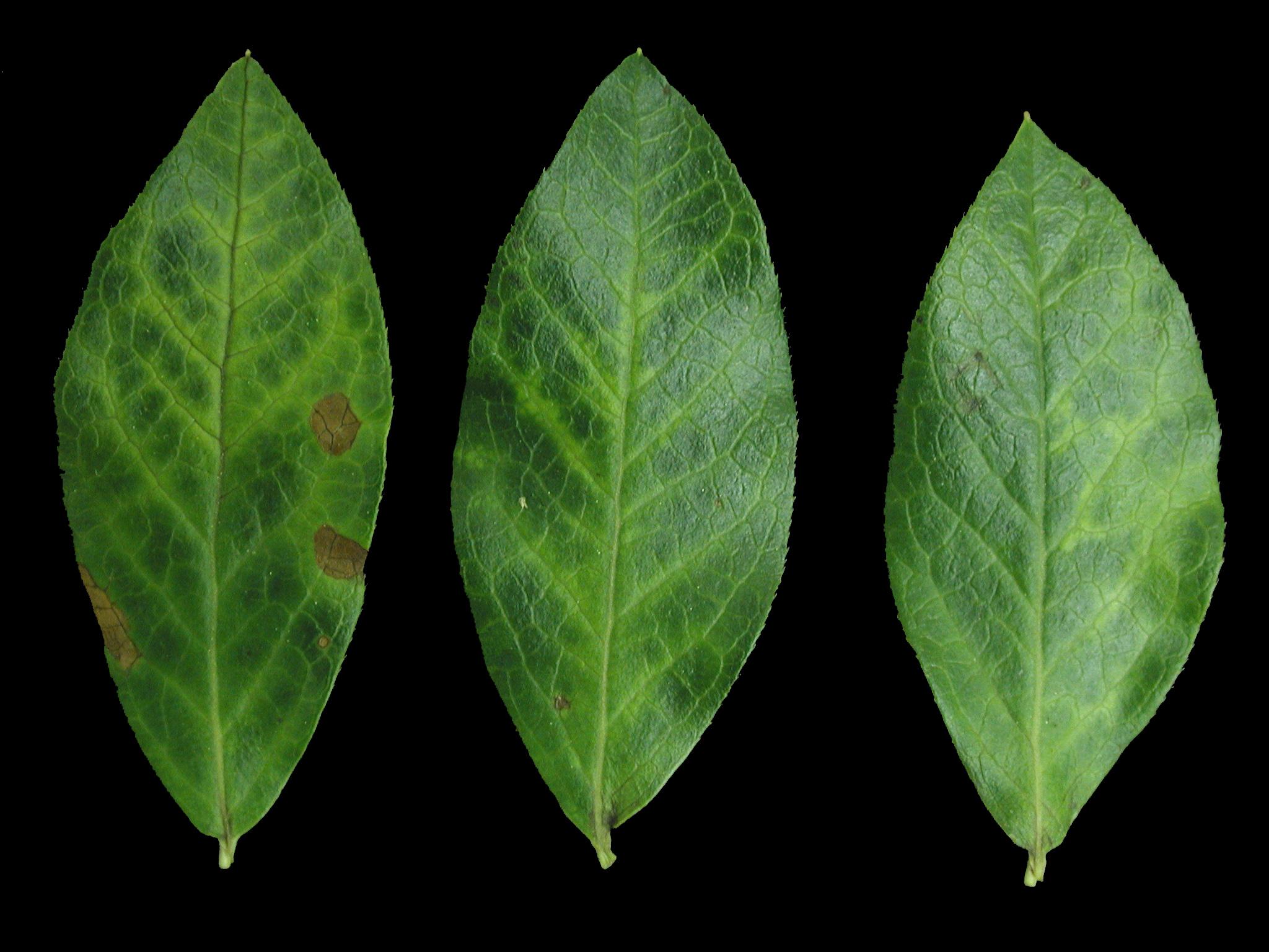 Le premier symptôme observé sur les feuilles de bleuet en corymbe est un jaunissement des nervures, suivi d’un brunissement et d’une brûlure comme celles observées sur la feuille de gauche. Ces symptômes sont causés par une phytotoxicité à l'herbicide terbacil (Sinbar) et affectent principalement les vieilles feuilles.