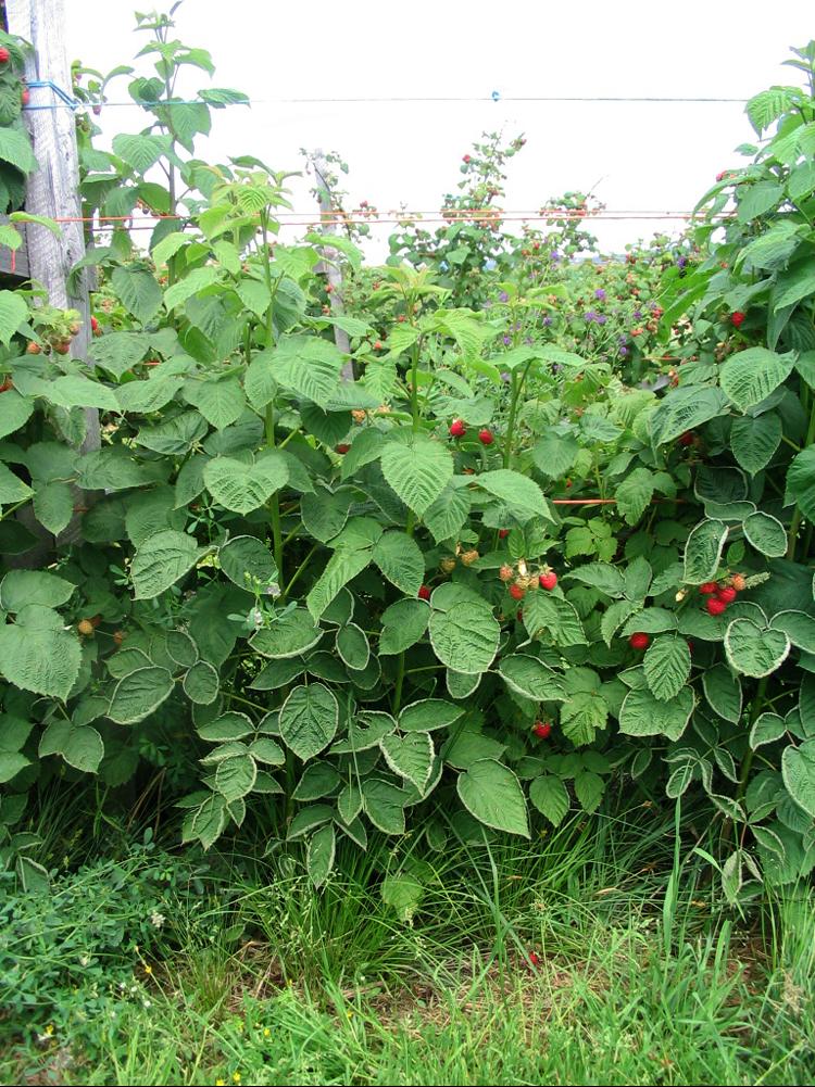 La marge des feuilles basales de framboisier est enroulée en forme de cuillère. Hormis l’enroulement de la marge, les feuilles ne présentent pas d’autres symptômes. Ce symptôme est causé par l’herbicide clopyralide (LONTREL 360). Le LONTREL 360 a été appliqué localement, à la mi-juillet, pour lutter contre la vesce jargeau dans la framboisière et il y a eu contact de l’herbicide avec les feuilles de framboisier.
