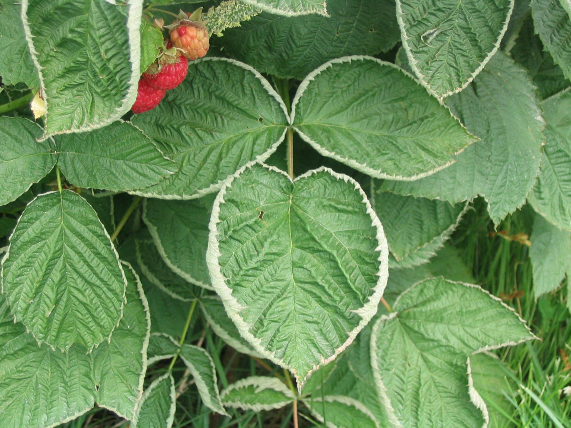 Une vue rapprochée montre l’enroulement en forme de cuillère de la marge des feuilles basales de framboisier. Ce symptôme est causé par l’herbicide clopyralide (LONTREL 360). Le LONTREL 360 a été appliqué localement, à la mi-juillet, pour lutter contre la vesce jargeau dans la framboisière et il y a eu contact de l’herbicide avec les feuilles de framboisier.